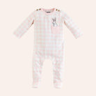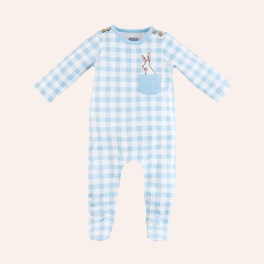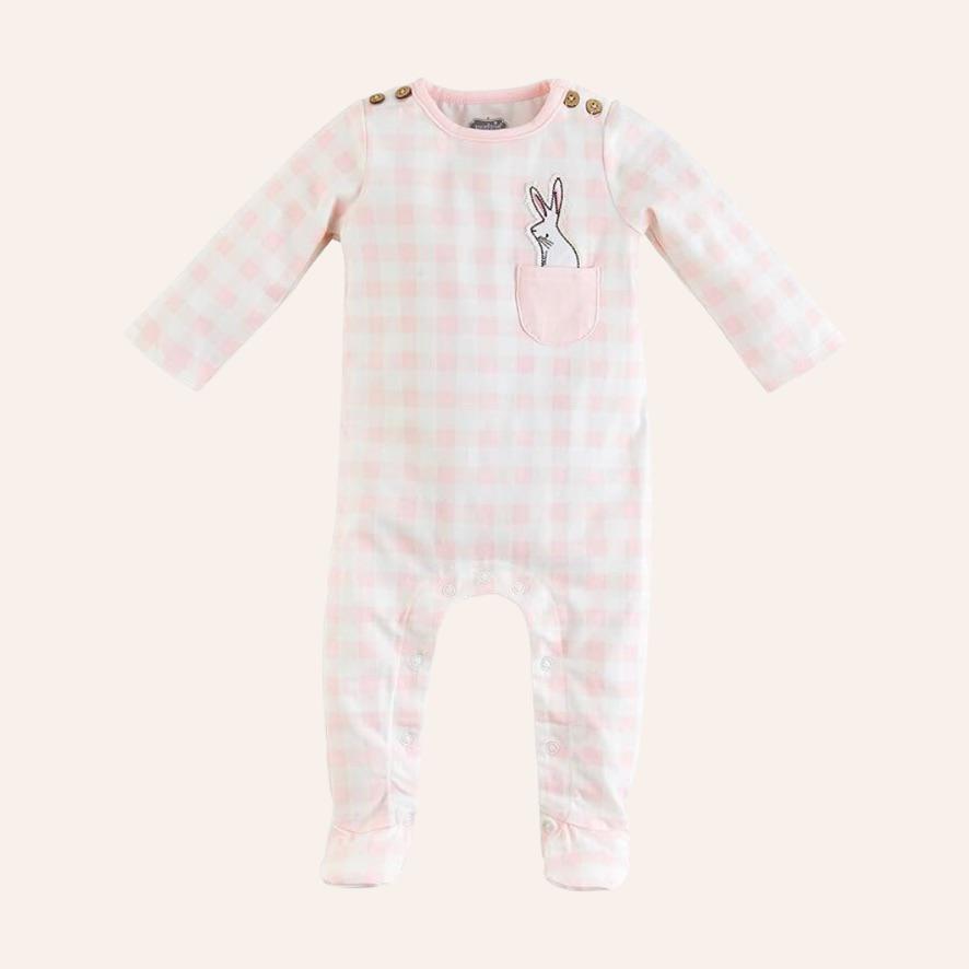The Easter Bunny came early and brought this super sweet Pink Bunny Pocket Baby Sleeper and Blue Bunny Pocket Baby Sleeper. The cotton spandex footed sleeper features a bunny chest pocket. The sleeper also features a coconut wood button shoulder placket. The bunny sleeper has an inner leg snap closure.