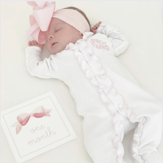 1. Double Ruffle Detailing: Our footie features charming double ruffles in pink, adding a playful and feminine touch to the classic white design. The ruffles adorn the neckline and cuffs for a sweet and stylish look.