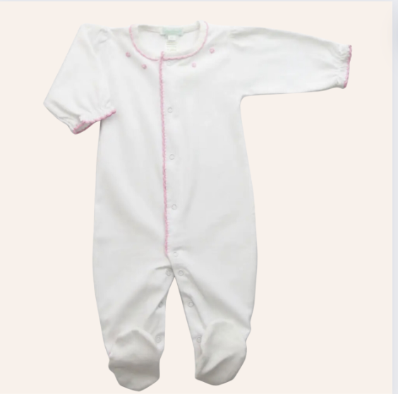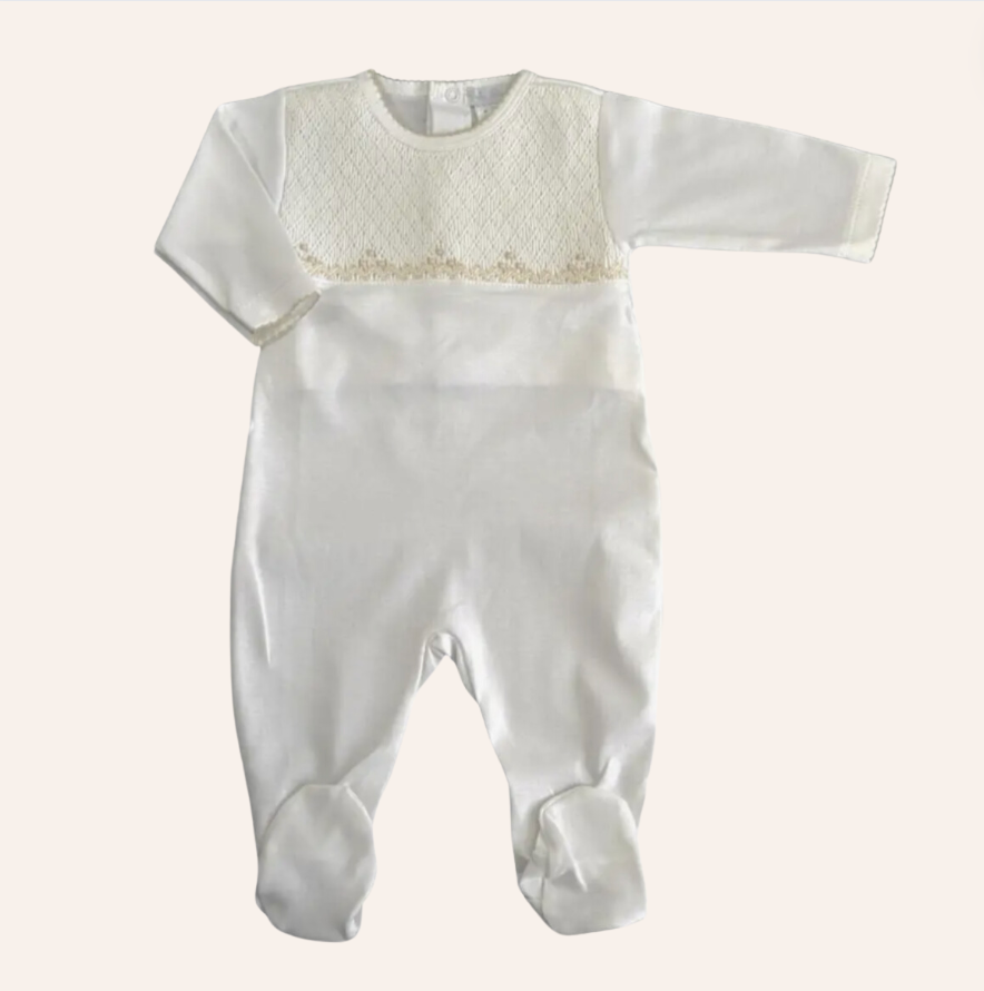 BT Hand Smocked White and Blue Pima Cotton Baby Footie with Collar