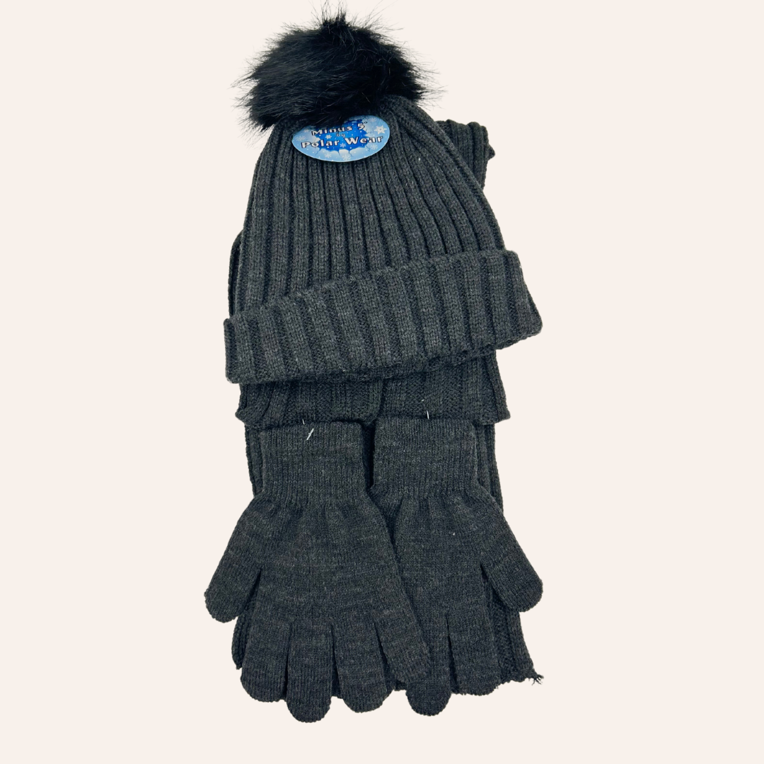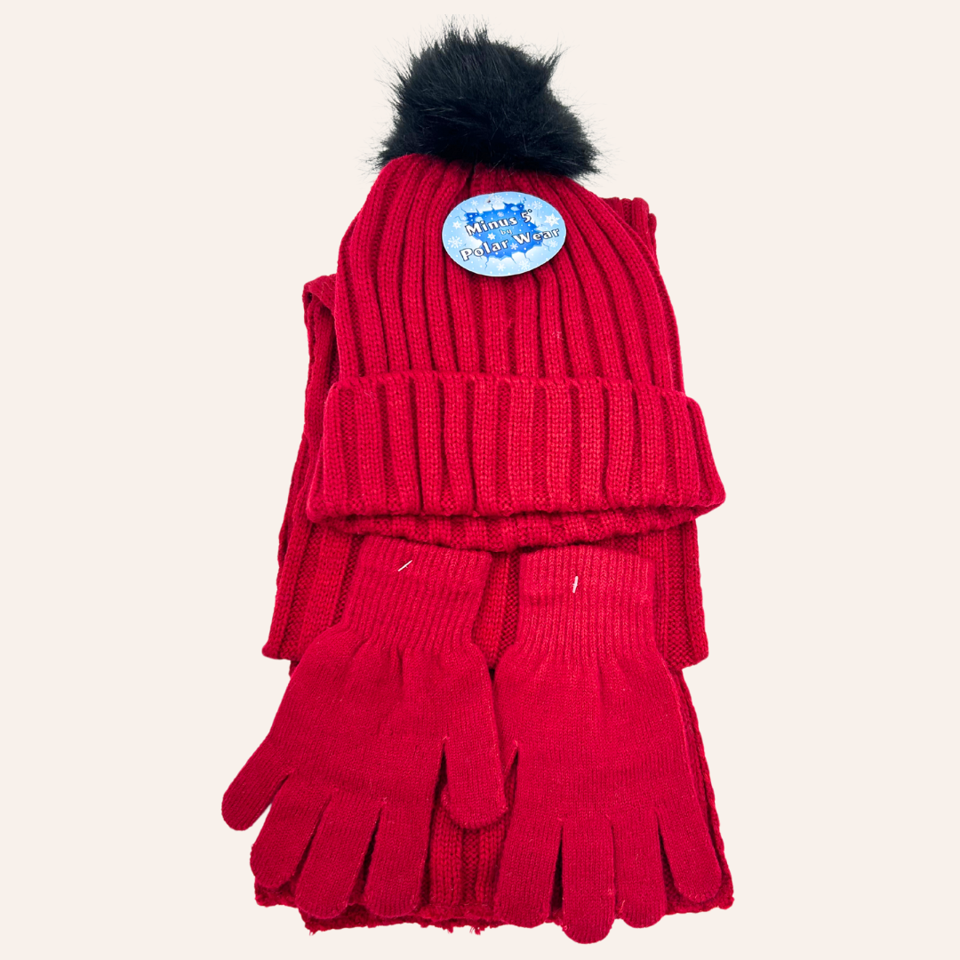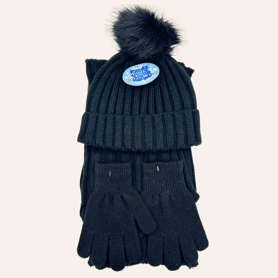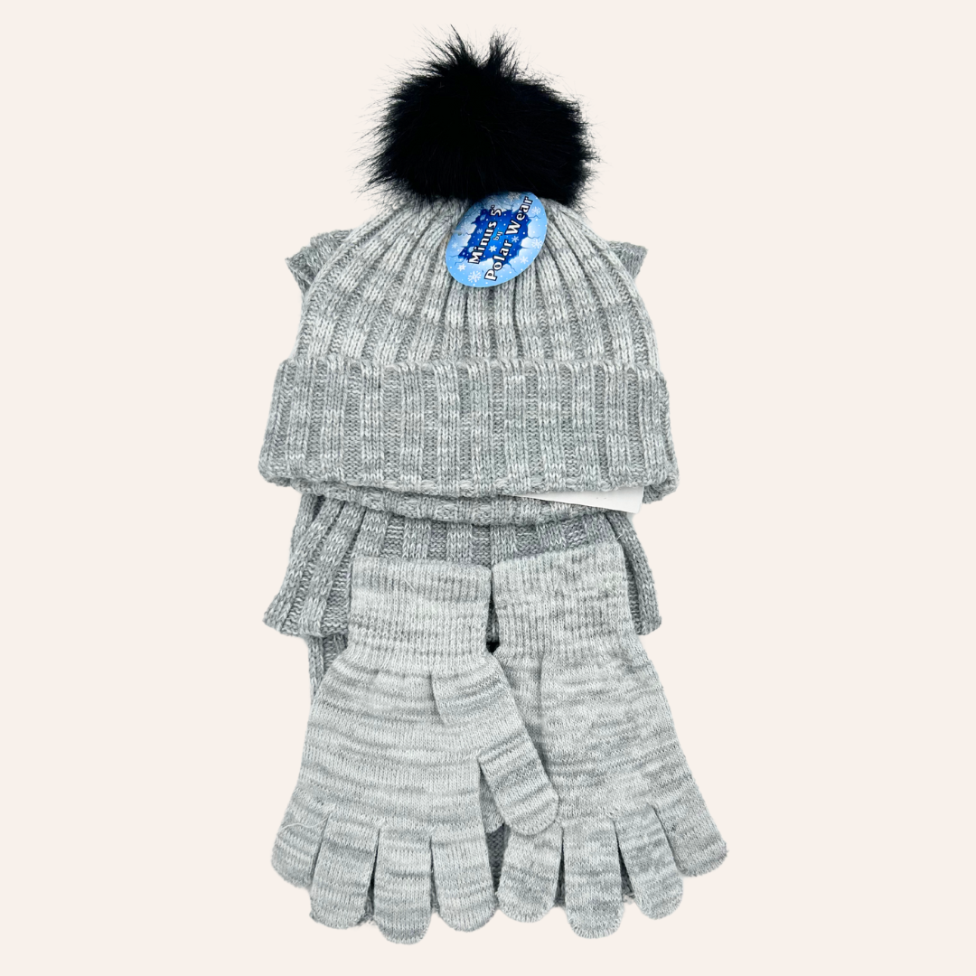 Stay cozy with this stylish pom pom beanie set, complete with matching gloves and a scarf. Perfect for cold weather, this set offers warmth and charm in one.