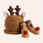 Dress your little one up with our reindeer hat and sock set. The two piece set comes with a chenille reindeer hat. The hat has dimensional ears and antlers. The set also comes with coordinating socks that feature a reindeer face, red nose and antlers. This set is super soft and cozy.