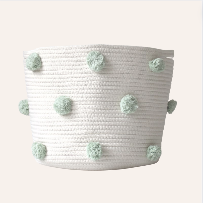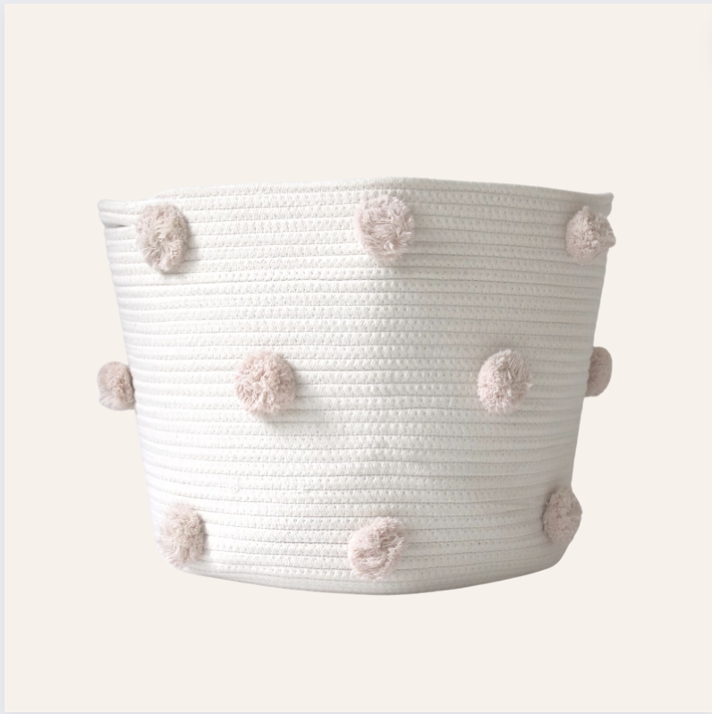 Elevate your home organization with our charming White Woven Rope Basket adorned with Pom Poms in pink and green, a delightful blend of functionality and whimsical style! Crafted with care from durable woven rope, this basket effortlessly combines practicality with playful design elements to add a touch of cheer to any space.
