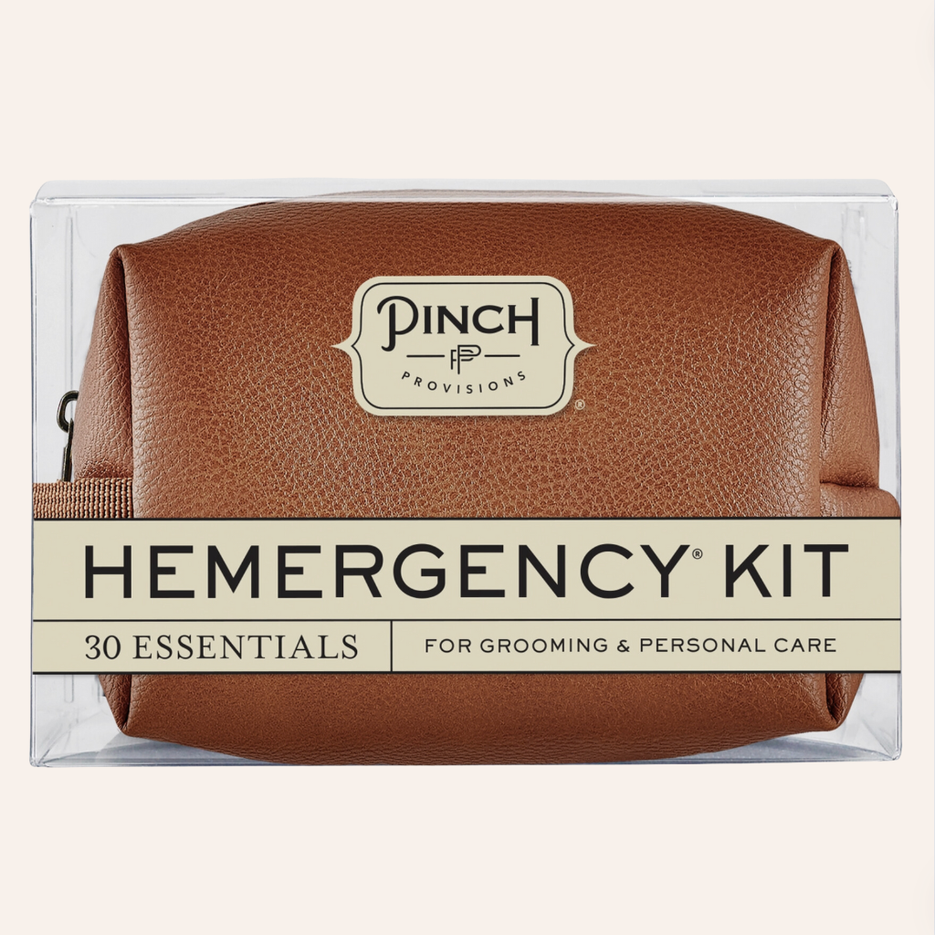 Guys have emergencies, too. Available in cognac vegan leather, the 30-piece Hemergency Kit by Pinch Provisions is perfect for desk, travel, or anywhere in between. Kit contains: Stain remover towelette, deodorant towelettes, shaving cream, adjustable collar stays, razor, adhesive bandages, mending kit, safety pin, breath freshener, static remover, lip balm, pain reliever extra buttons, safety pin, nail clipper, dental floss, wrinkle remover, multipurpose card tool, mini comb, lint brush, cufflinks, facial tissues, shoe shine towelettes.