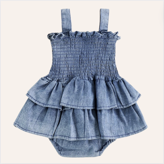 Denim, made of high-quality fabric, comfortable, soft, breathable and skin-friendly.The baby girls onesie romper has fly sleeve, crew neck, flower printed, crotch buttons are convenient for diaper changing, comes with a headband, fashionable and lovely.