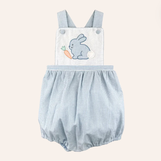 A fun and sweet Easter outfit. This sleeveless bubble comes in a light blue gingham fabric with a sweet Easter bunny and carrot embroidered on the front.