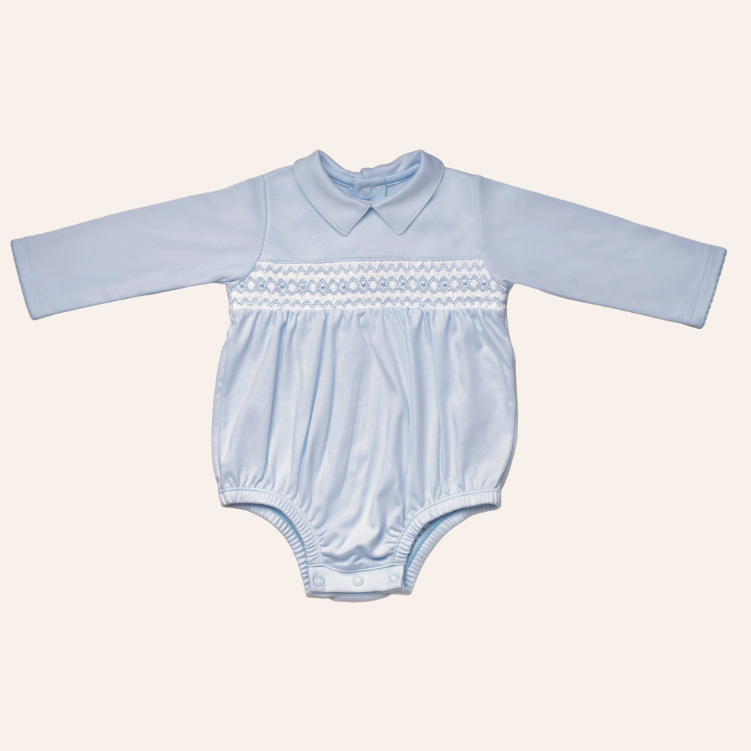 This baby blue long-sleeved bubble features a shirt-style collar and a handcrafted smocking, detailing elegant blue accents.