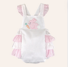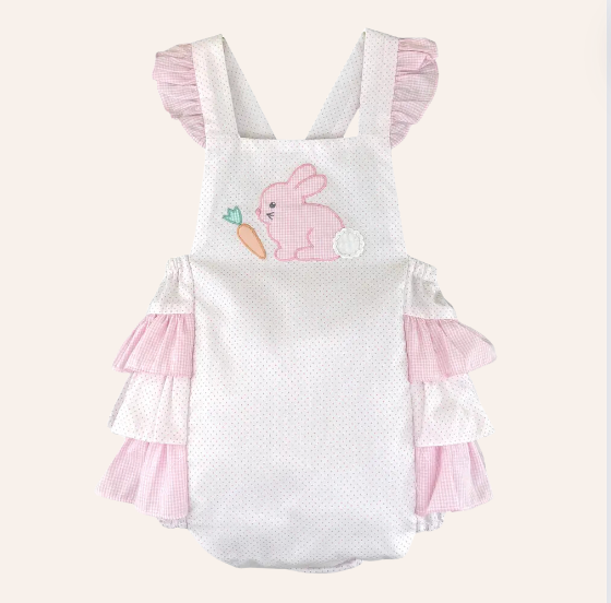 A fun and sweet Easter outfit. This sleeveless bubble comes in a light pink dot fabric with a sweet Easter bunny and carrot embroidery on the front.