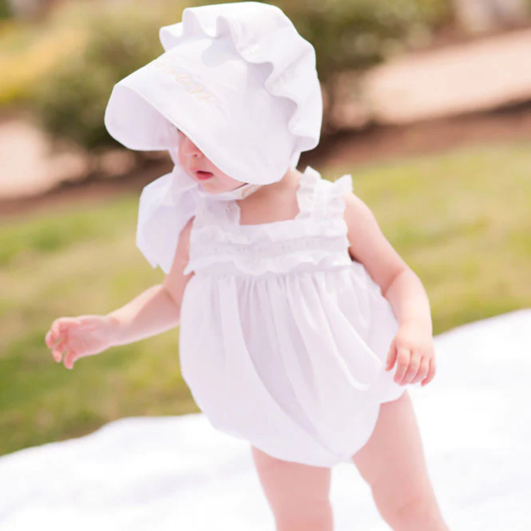 Bonnets, bubbles, and eyelet - oh my! The Babs Bubble is made with fine Batiste cotton fabric and buttons in the back. The snaps make it easy, and the eyelet makes it- simply adorable!