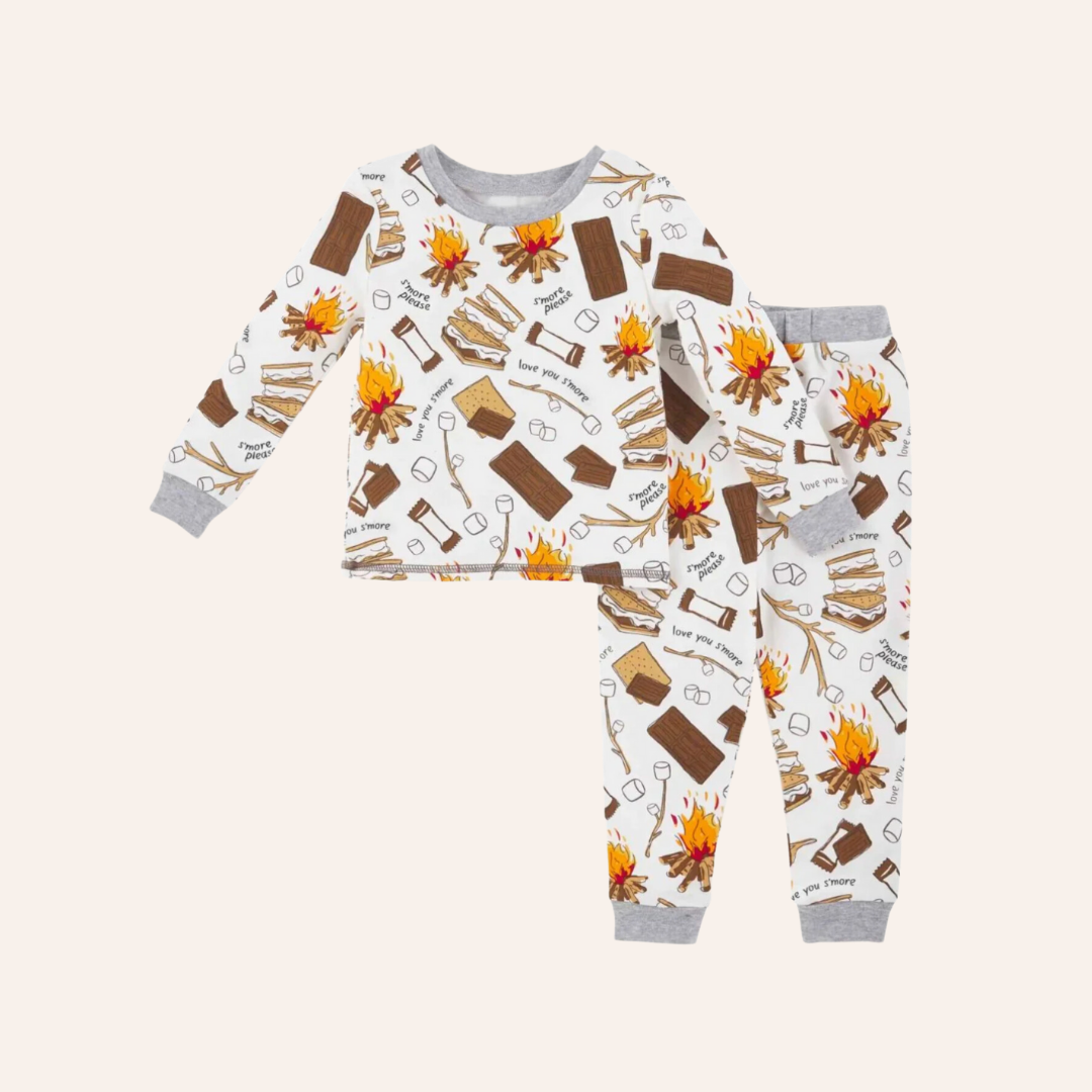 Mud Pie has just brought us adorable S'mores Pajama Set of Top and Bottom! This set features many an allover campfire themed print with marshmallows and chocolate! Super cozy and comfy.