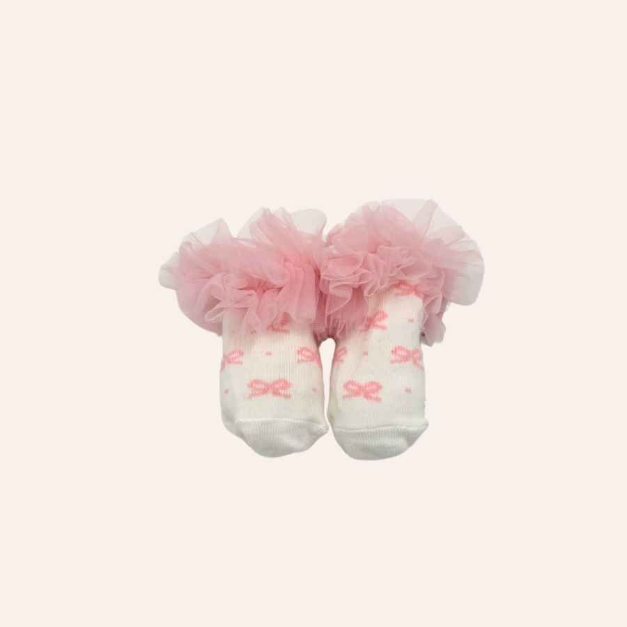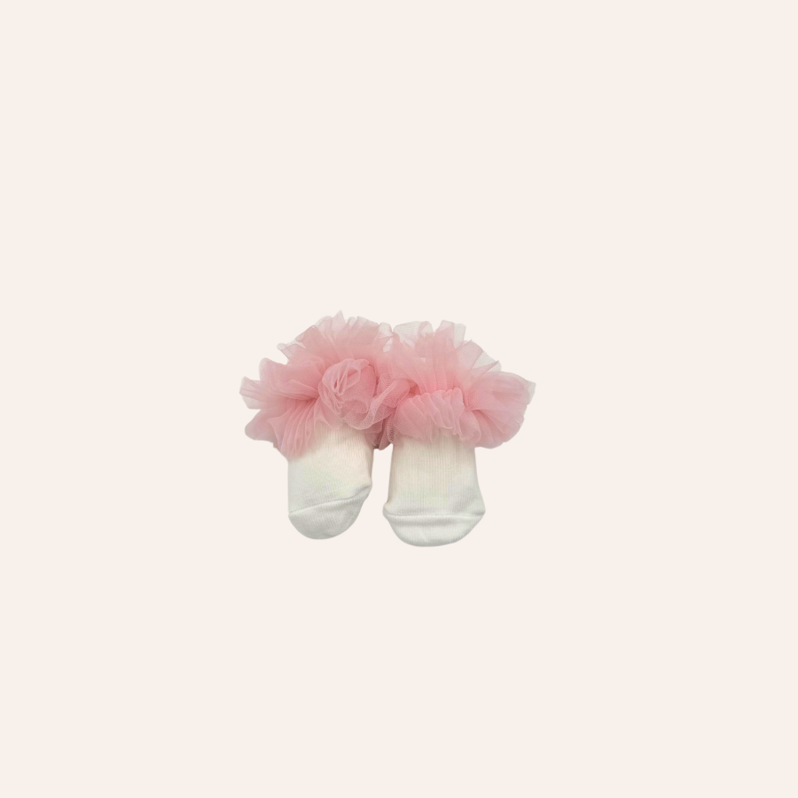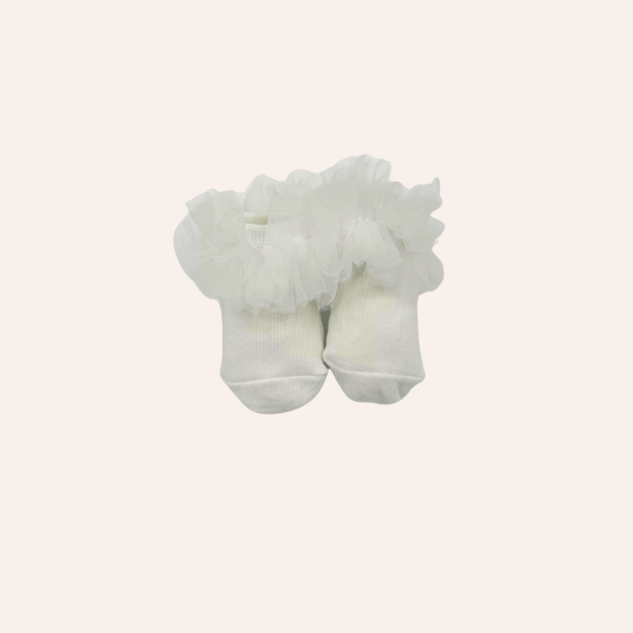 Cotton hosiery socks with mesh tutu ruffle. Size 0-6M.