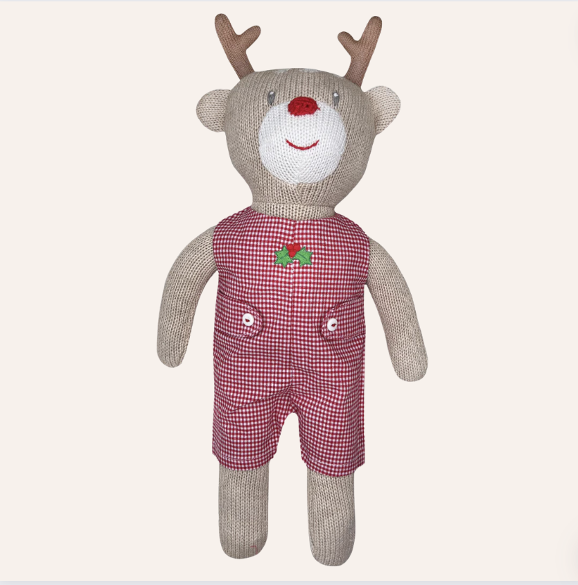 This hand-knit reindeer doll comes with an adorable red check romper that can easily match to any holiday or Christmas outfit! This 100% cotton knit reindeer doll makes the perfect friend for meeting family photos or waiting up for Santa to come. The simple design of the outfit is also great for monogramming!