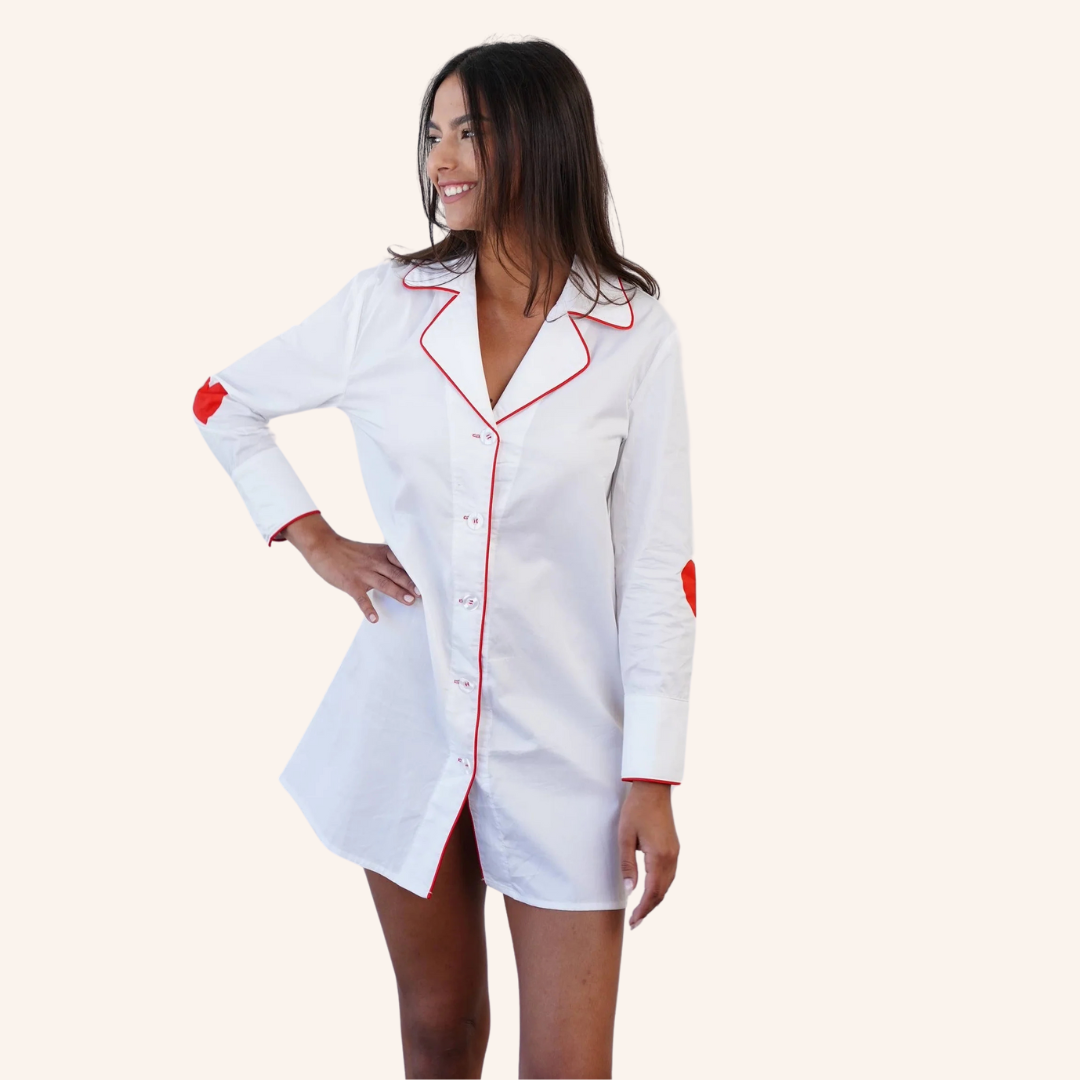 The Heart Elbow Long Sleeve White Pajama Dress combines comfort and charm with its relaxed fit. Featuring playful red heart details on the elbows and long sleeves. This cozy, white dress is perfect for lounging or sleeping in style.