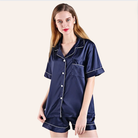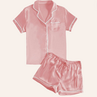 The set includes a short-sleeve silk top with a classic collar and button-down front, exuding sophistication and timeless style. Paired with matching silk shorts featuring an elastic waistband for a comfortable and adjustable fit, this set is designed for a relaxed and cozy sleep experience.
