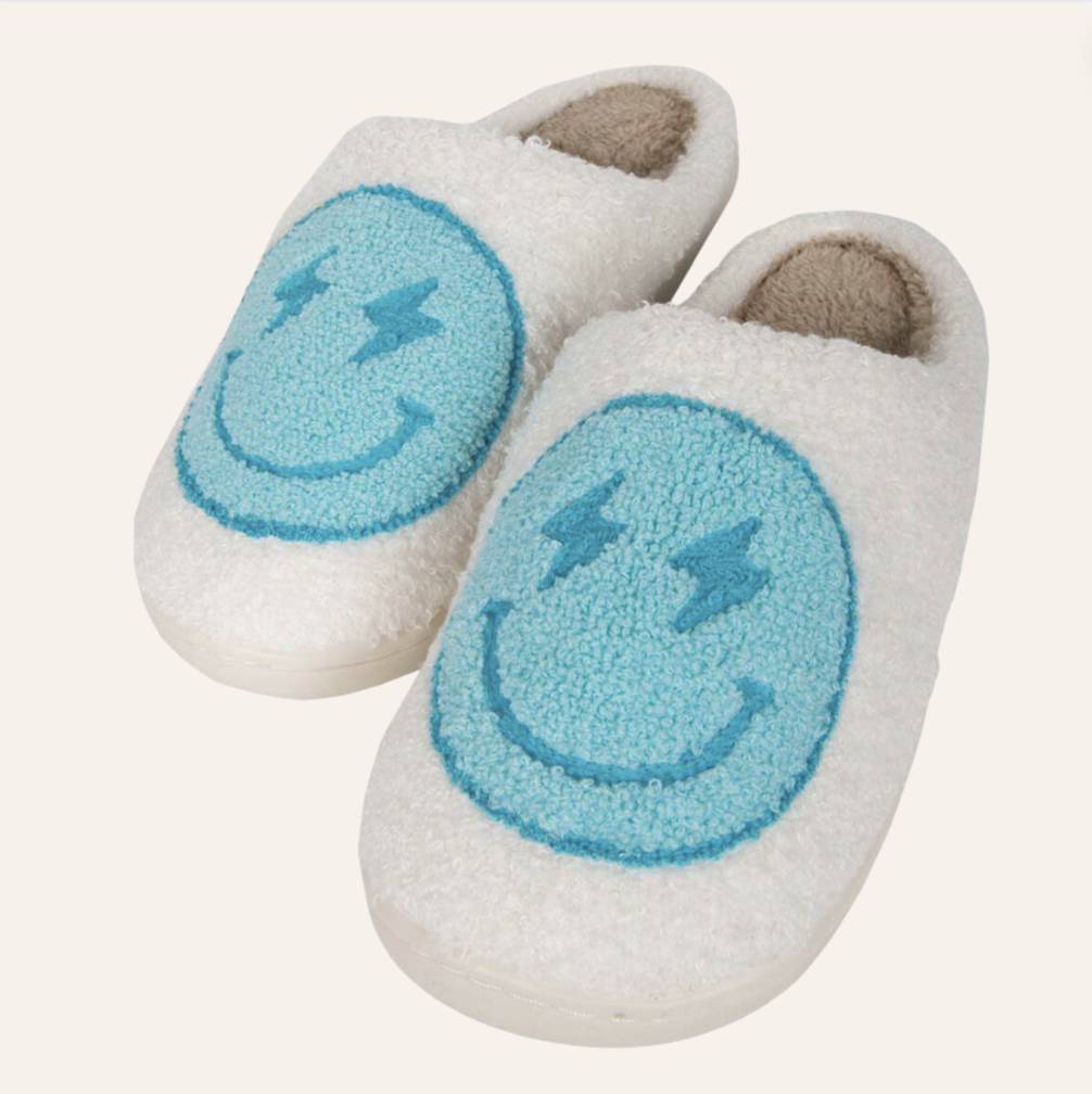 Women's Slippers - KD White with Turquoise Lightning Bolt Smiley