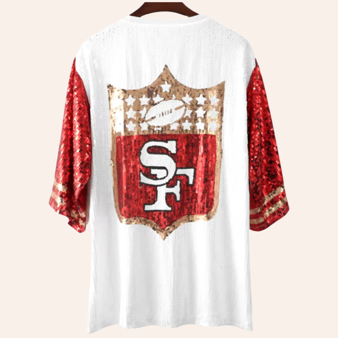 Rep your team in style with the 49ers Sequins Short Sleeve T-Shirt Jersey. Featuring a sparkling sequined 49ers logo, this tee combines team pride with a fun, stylish twist. Perfect for game days or casual wear, it’s comfortable, lightweight, and a great addition to any fan’s wardrobe.