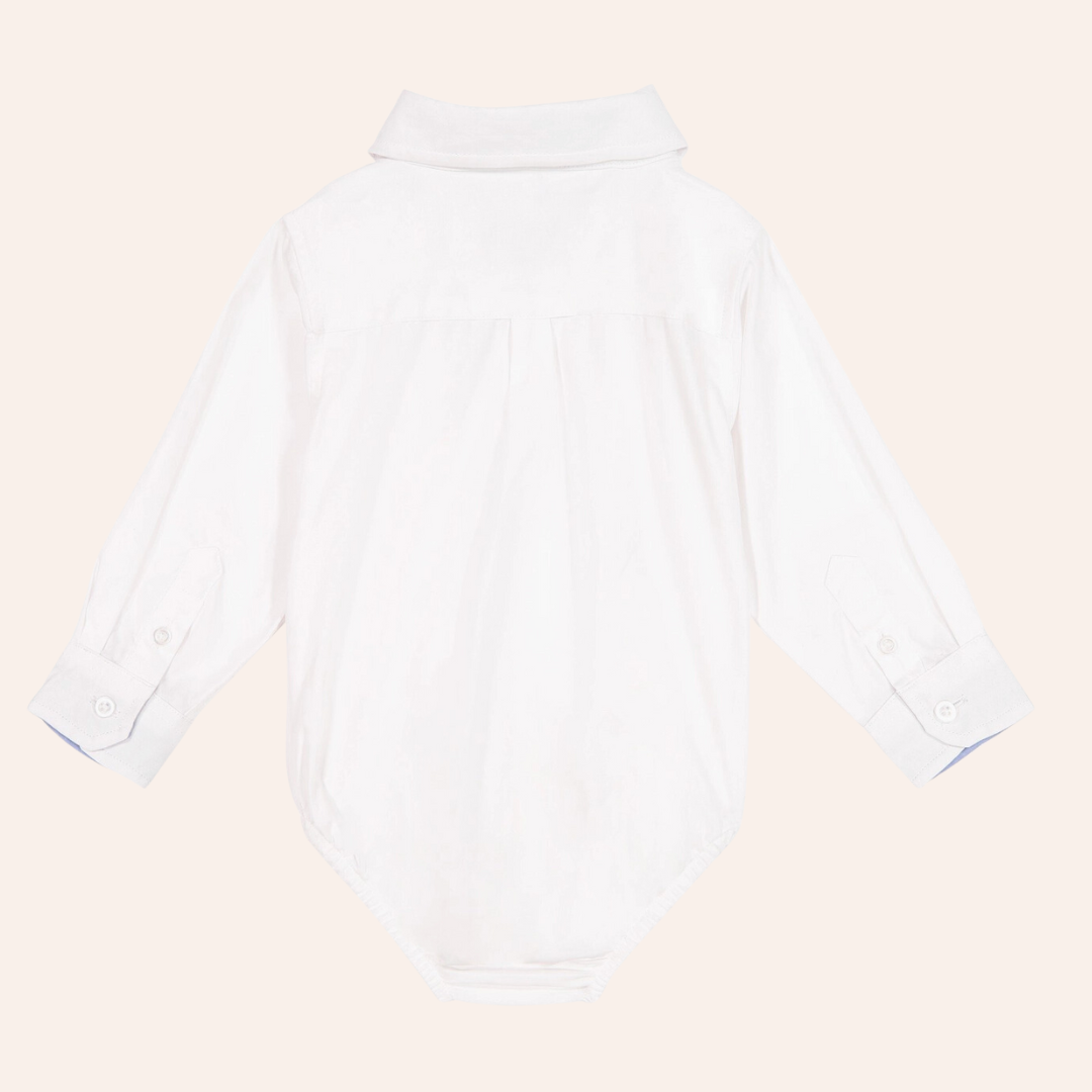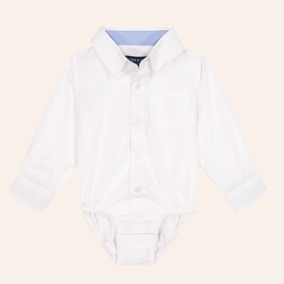 For the more formal events he has this fall, he won't have to worry about maintaining his dapper and debonair reputation when he's sporting this classic White chambray button down shirt. Please note: sizes 3-24 months comes as a shirtzie™ with bottom snap closures. Machine wash cold; tumble dry medium. Imported. Easy care. Wrinkle resistant. Extra soft. Chest pocket. Accented cuff.
