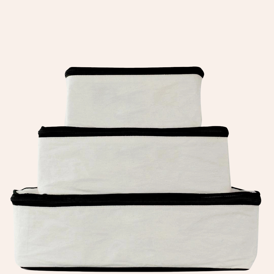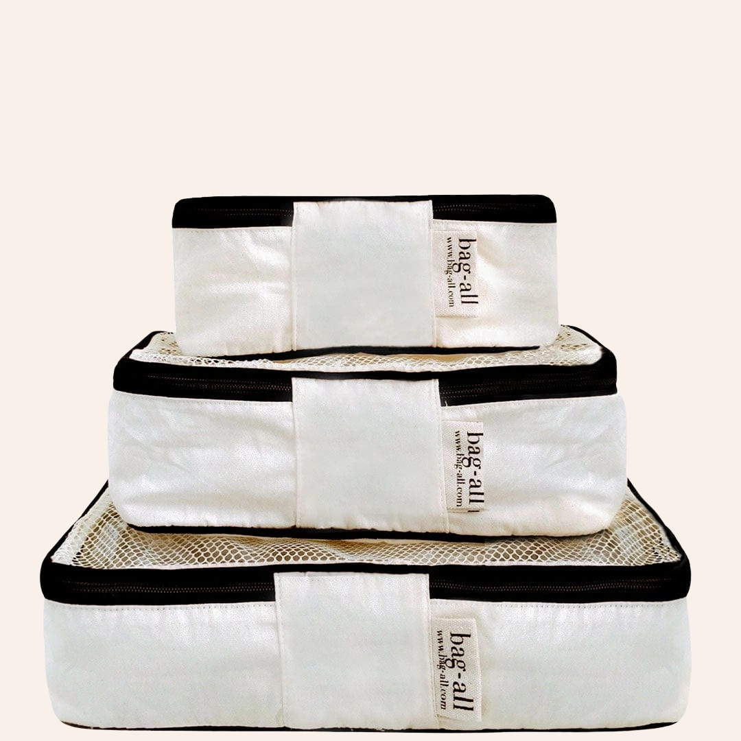 Make your packing as easy as possible with our popular packing cubes in natural cream cotton! These lightweight cubes help keep your bag organized while not adding too much extra weight to your suitcase. These chic packing cubes compress your clothes, making space for more storage where you need it. When you get to your destination, simply put the packing cube in your closet, And voila- done!