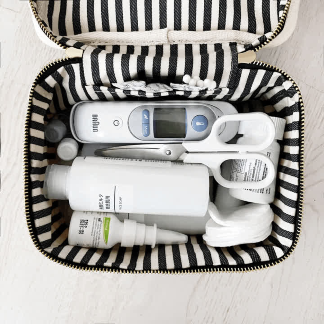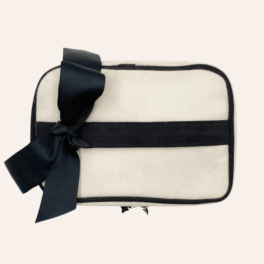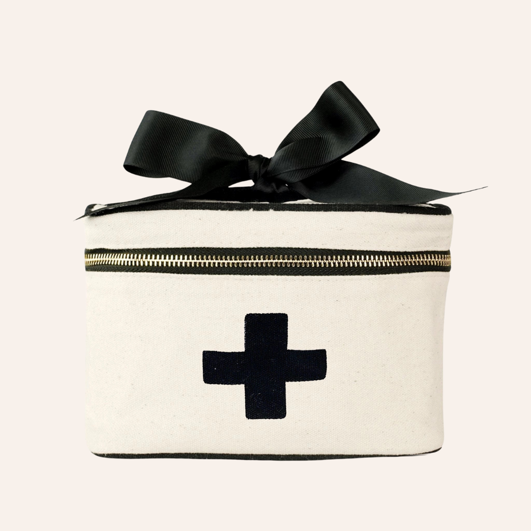 Keeping everything nice and tidy is our idea of heaven. Our first aid storage box will keep all of your medicines, band-aids and such, in one place while looking incredibly stylish. It's perfect as a travel organizing case but also for bathroom storage at home! The travel organizing case is made of eco-friendly natural cotton in cream, with a super cute black cross print. The top quality zipper closure making sure all your emergency products are kept safe inside. The box has a strong handle on the lid to make it easy to transport. It also comes with a grosgrain bow in black, made from 100% recycled PET-bottles. The interior is laminated with Bag-all signature striped lining, so no worries about any spills.