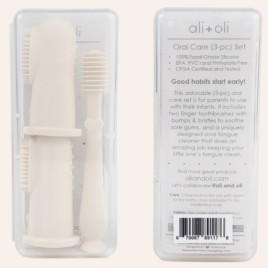 It is essential to start oral care early on. Our Ali+Oli baby finger brush and tongue scraper makes it easy to clean your baby's teeth as early as 3 months.