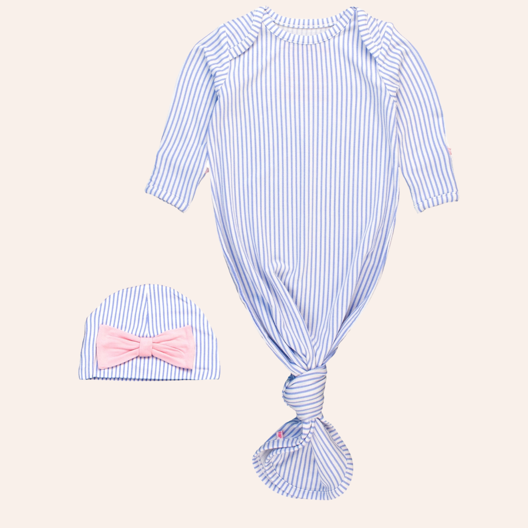 Baby Girls Periwinkle Blue Micro Stripe Bamboo Viscose Knotted Ruffle Gown & Hat Set