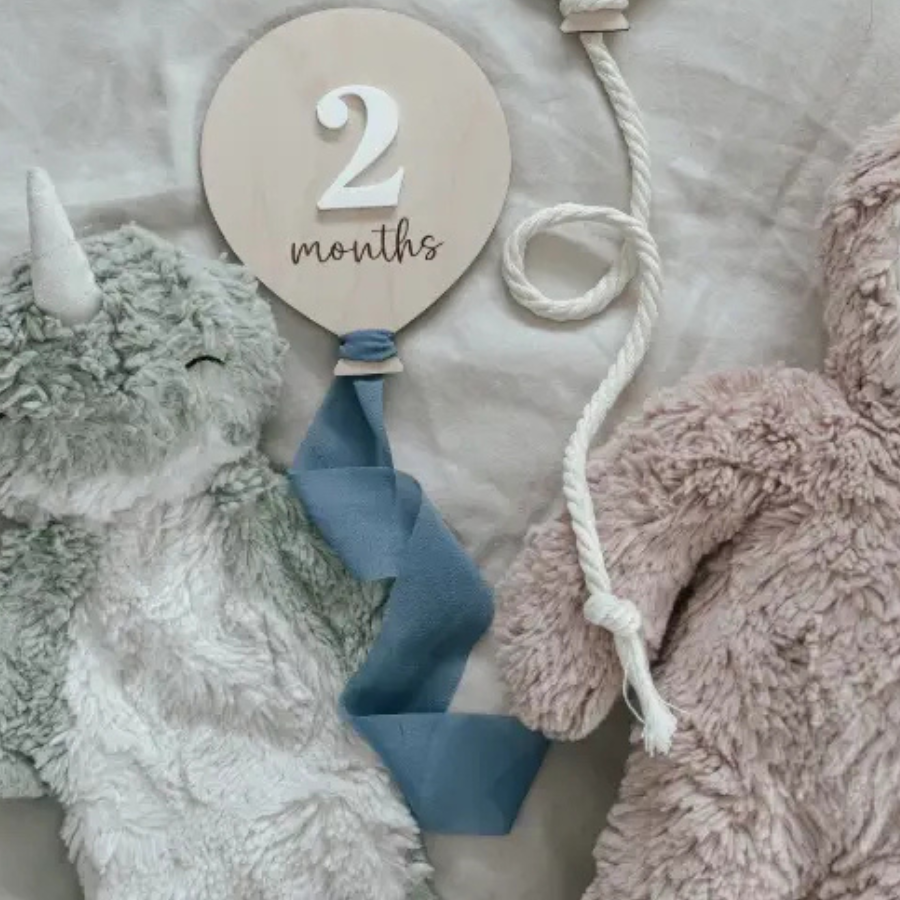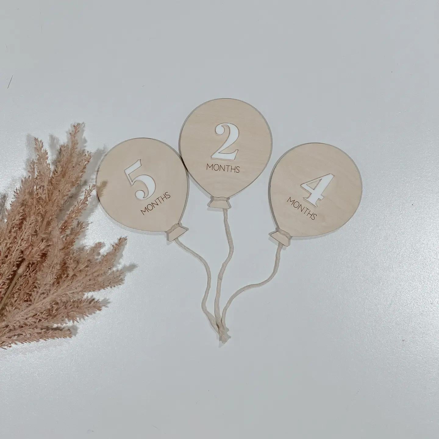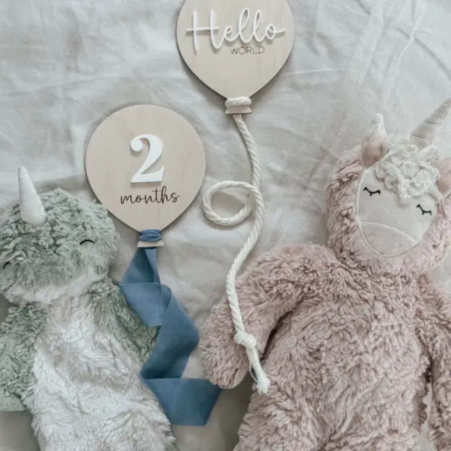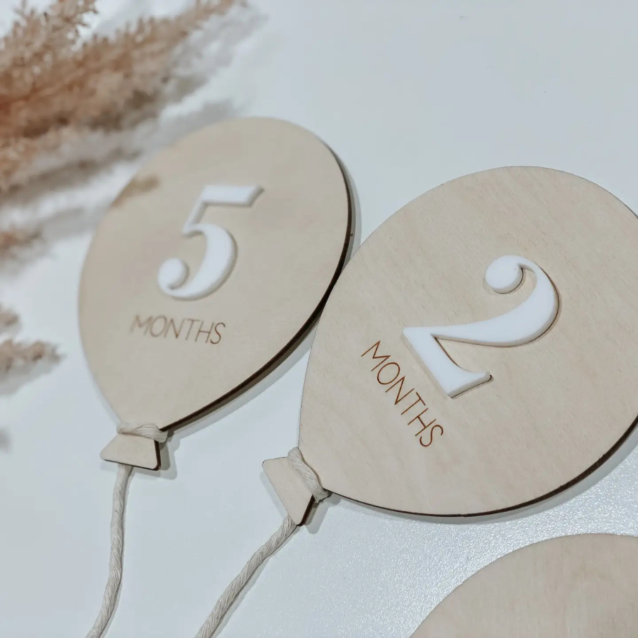 Milestone balloons are all laser cut and engraved from 3mm birch with a white acrylic number/text layered on top. The word "month/s" and "world" are laser engraved. Balloon sets will be shipping in clear cellophane packaging and ready to stock your shelves with!