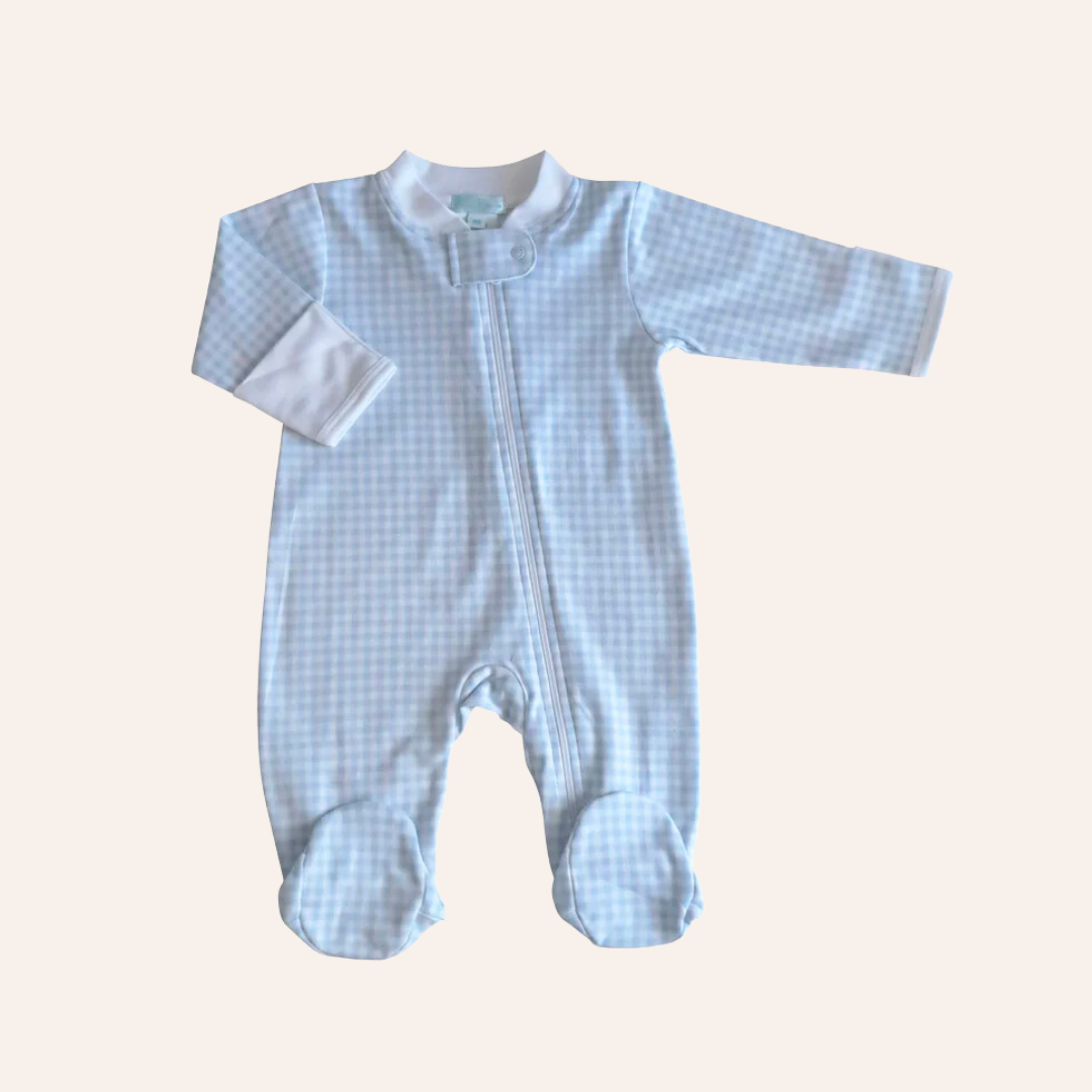 The classic blue checks and fine detailing elevate this footie, making it a stylish choice for your little man. Pair it with a cardigan or sweater for a polished look, or let it stand alone for casual outings.