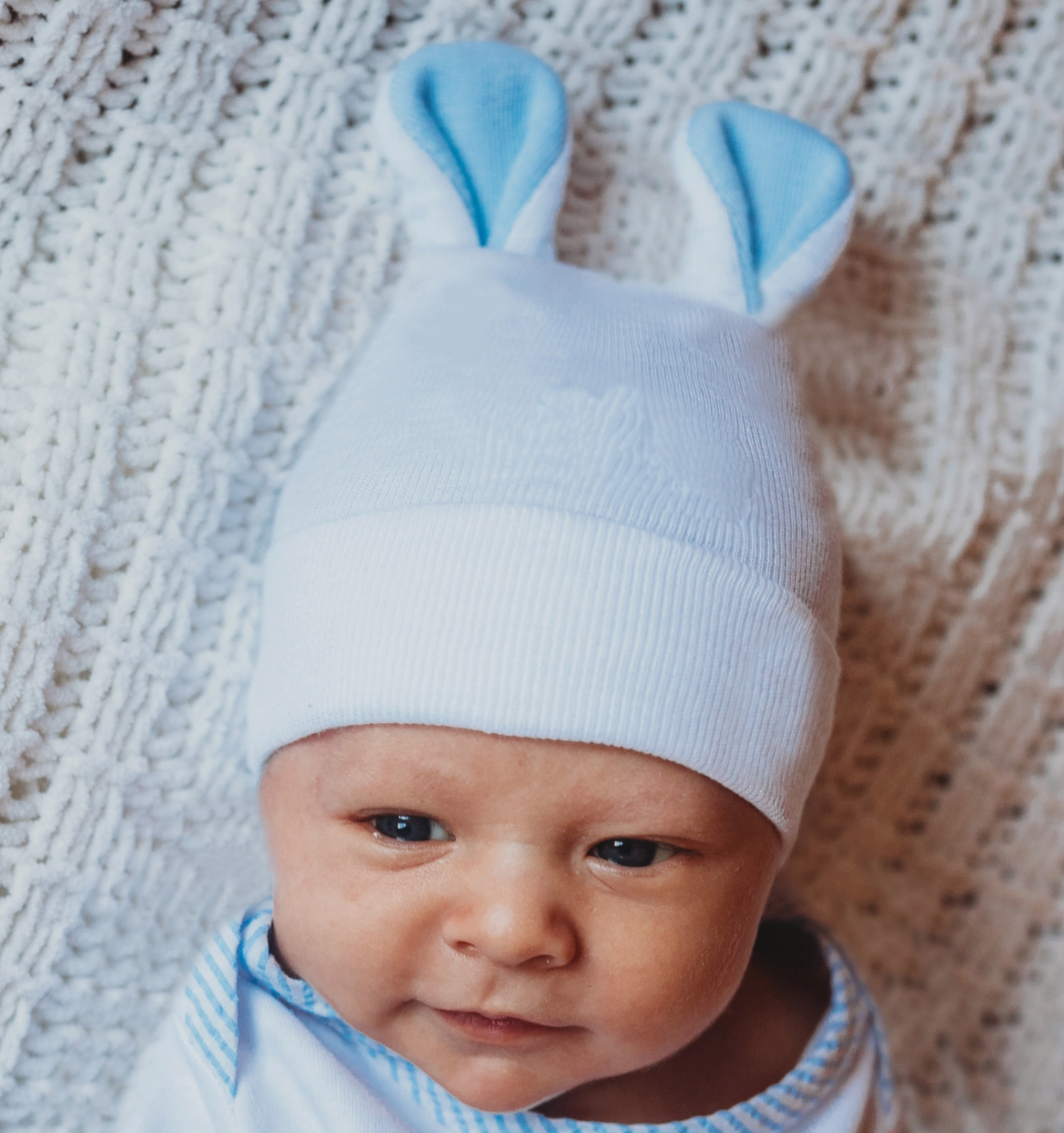 Great for Easter Babies! This newborn baby hat is featured in white hospital hat fabric with blue trimmed bunny ears! This is a great hat for the hospital for newborn boys born in the spring or close to Easter. All of our hats are made from 2 ply hospital hat fabric making them warmer and more plush than average hospital hats.