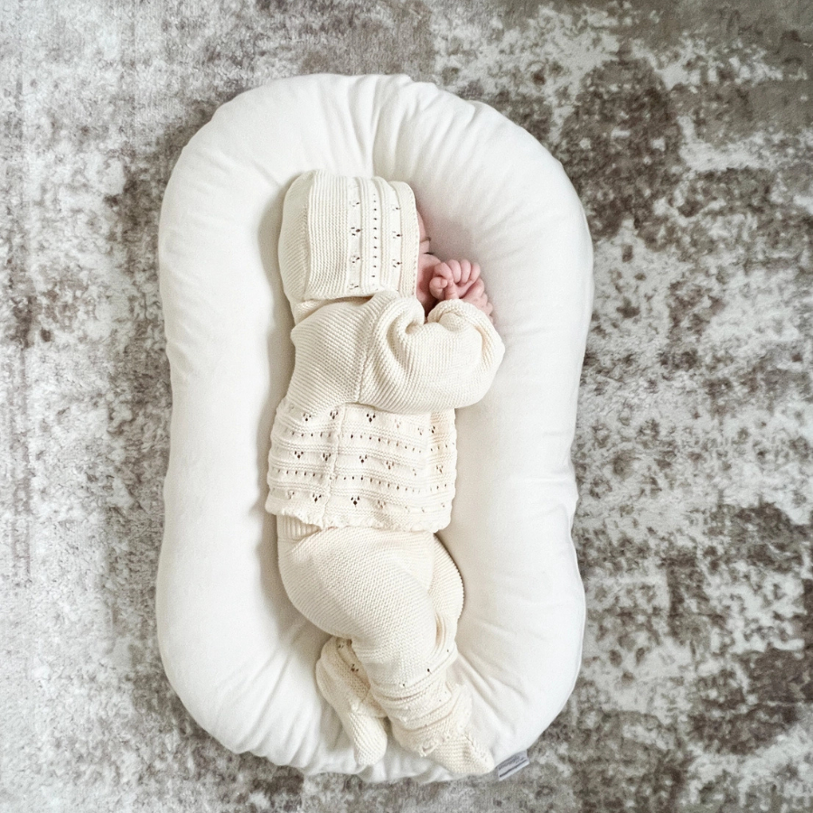 Snuggle up and bring your little one home in cozy style with our organic cotton chunky knit bundle. This "Bring Me Home" set includes the cutest bonnet, kimono top, pants, and booties in a pointelle and chunky knit.