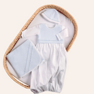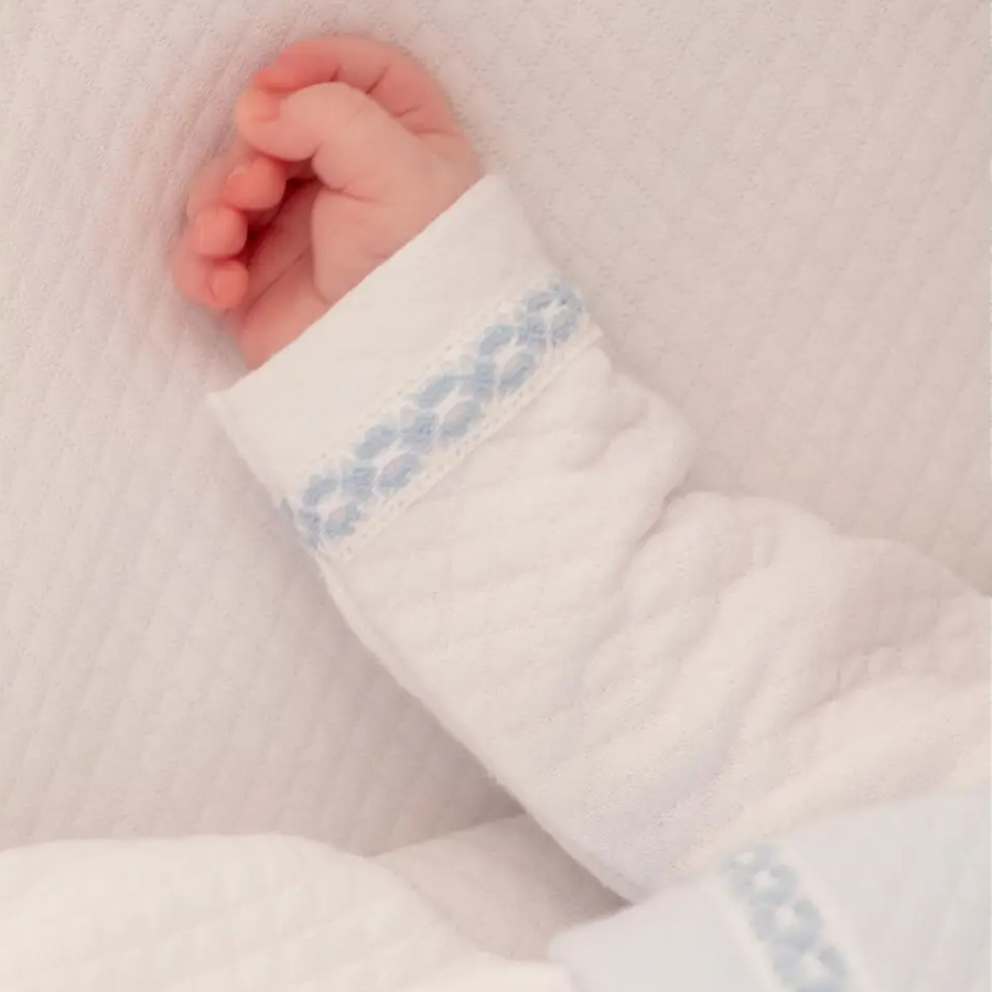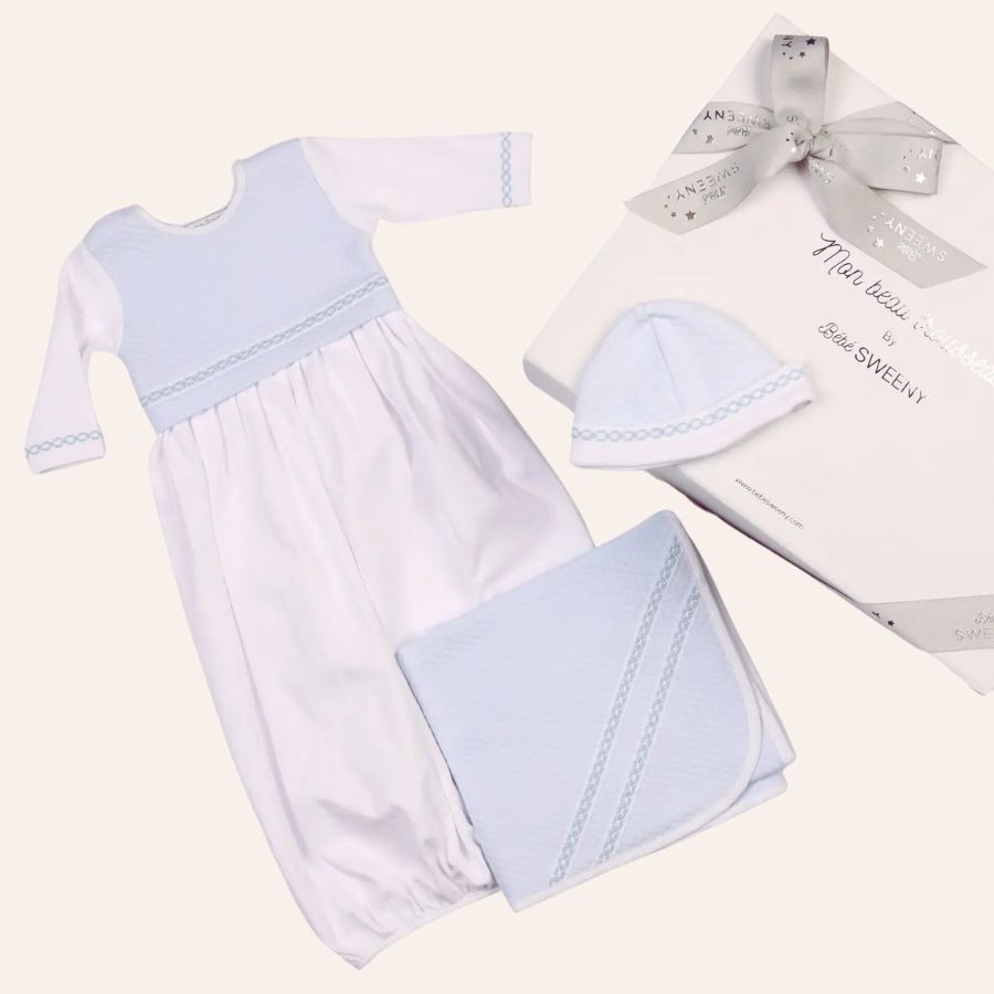 A lovely white and blue ceremony gown set for baby boys made in soft cotton. The white and blue lace accent adds a subtle special detail and the blue quilted cotton is as stylish as comfortable. This baby gown is functional with an elasticated hem and keeps baby covered while also allowing easy diaper changes. The matching blue blanket and hat complete this outfit that is as sweet as he is. It also makes a perfect bris outfit.