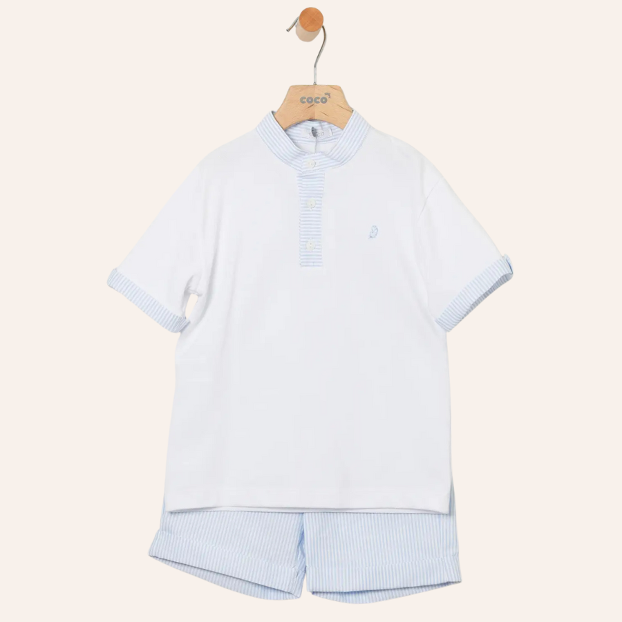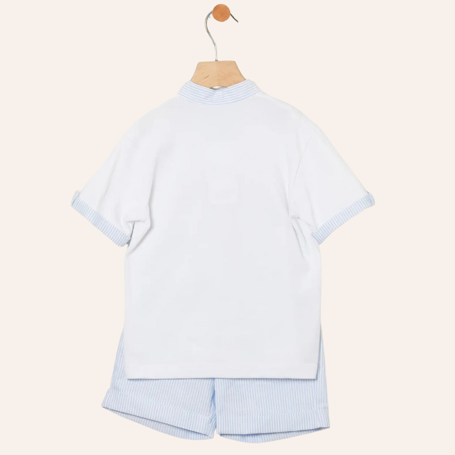 Boy's Set of White Polo with Trim on the Collar, Placket, and Sleeves with Light Blue Stripes and Light Blue Striped Bermuda Shorts.