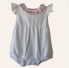 Gorgeous pima cotton bubble features a sweet pink dot print with solid pink ruffle collar detail. Snap closure on back and stride. This is a definite must have piece! 100% pima cotton.
