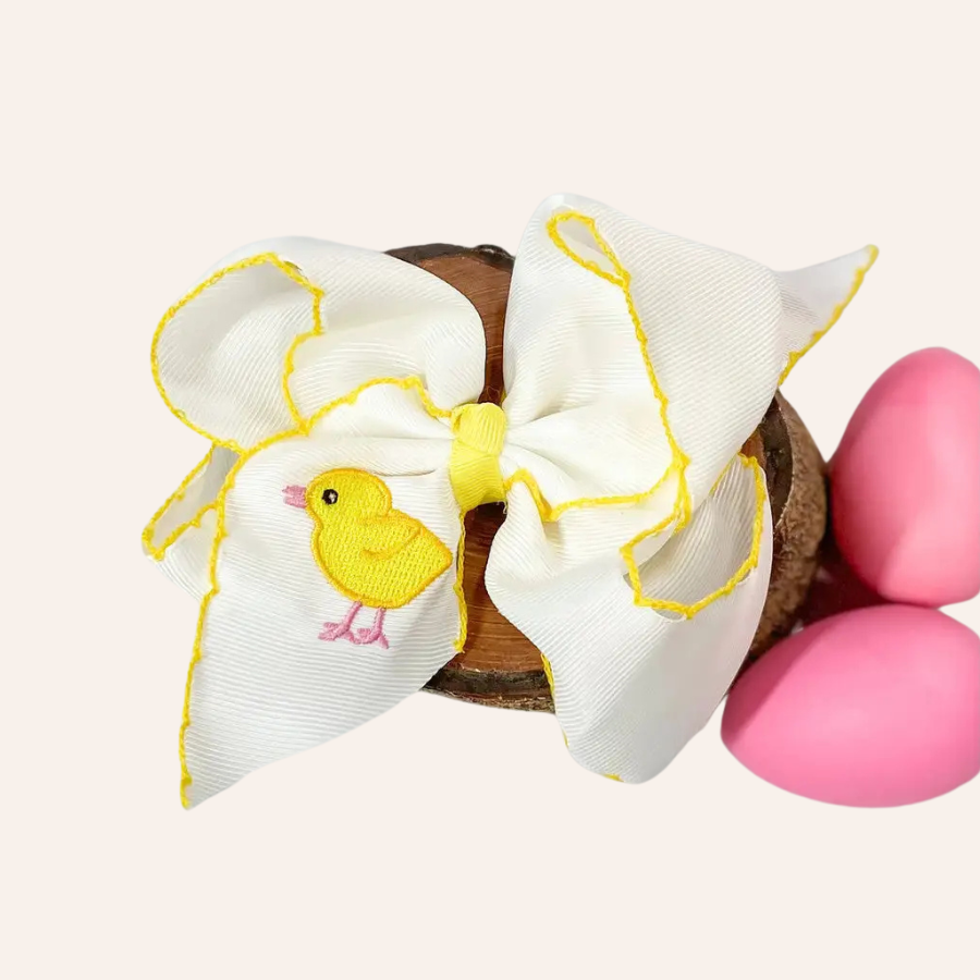 Brighten up any outfit with our Chick-A-Dee Moonstitch Embroidered Hair Bow! Made with high-quality materials, this playful accessory adds a touch of whimsy to your Easter looks. The perfect bow that's sure to make a statement (and keep your hair in place)!