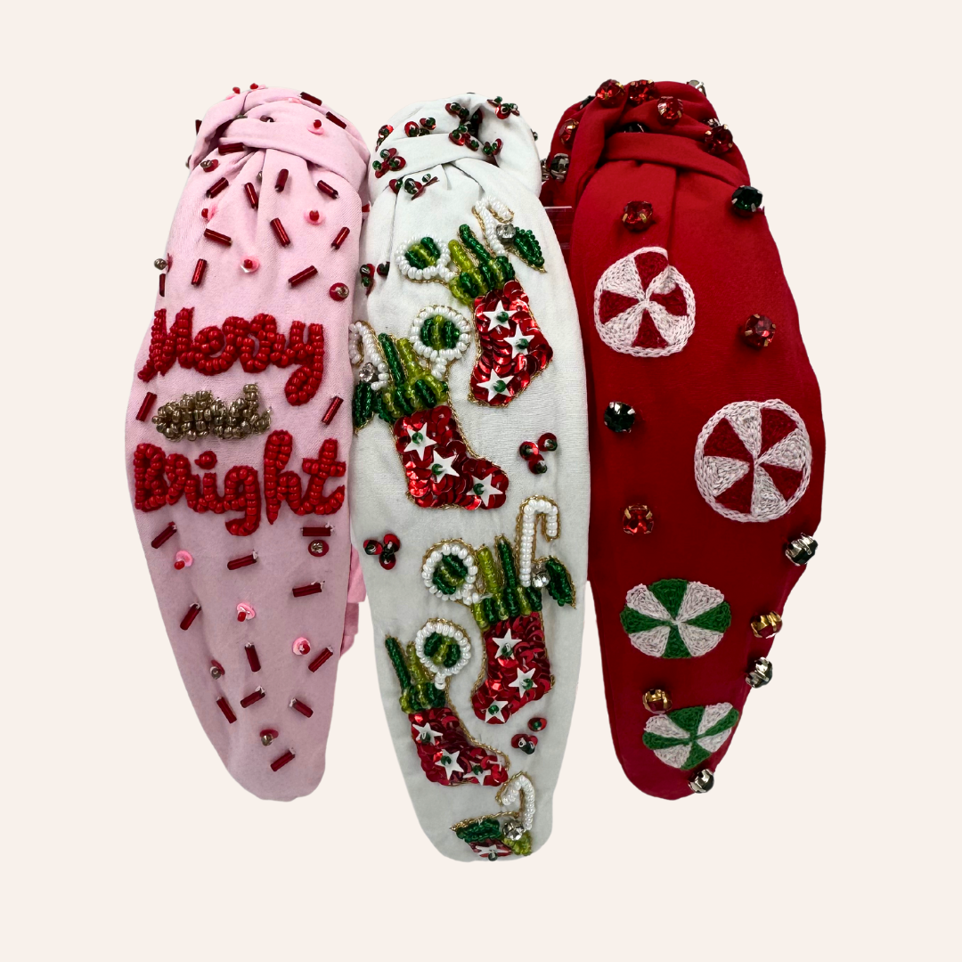 Celebrate the festive spirit in style with our enchanting Christmas headbands, hand-beaded to shimmer and shine throughout the holiday season. Each headband boasts joyful colors and intricate beadwork that captures the essence of Christmas cheer.