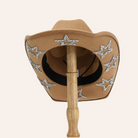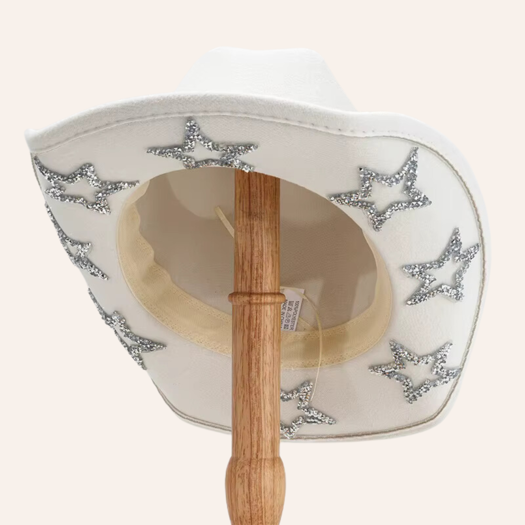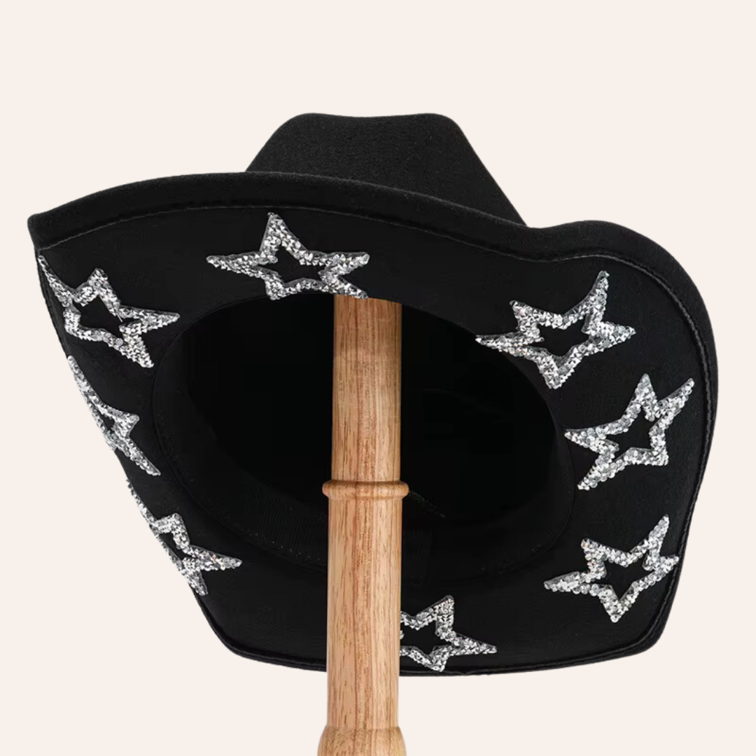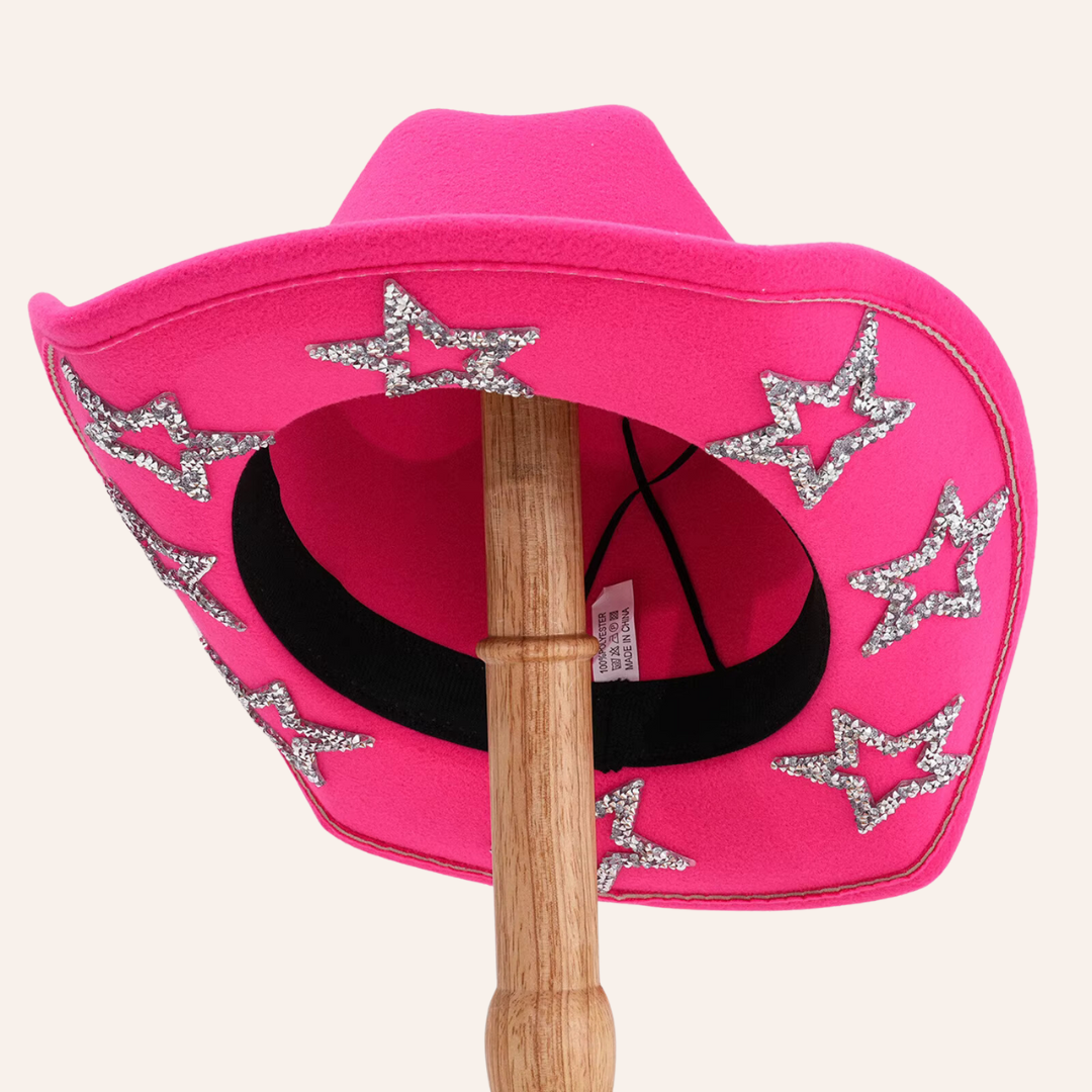 This stylish western cowboy hat features sparkling rhinestone stars, adding a touch of glam to a classic design. Available in five stunning colors: hot pink, ivory, beige, khaki, and black, it's the perfect accessory to elevate any outfit with a bold, western-inspired flair.