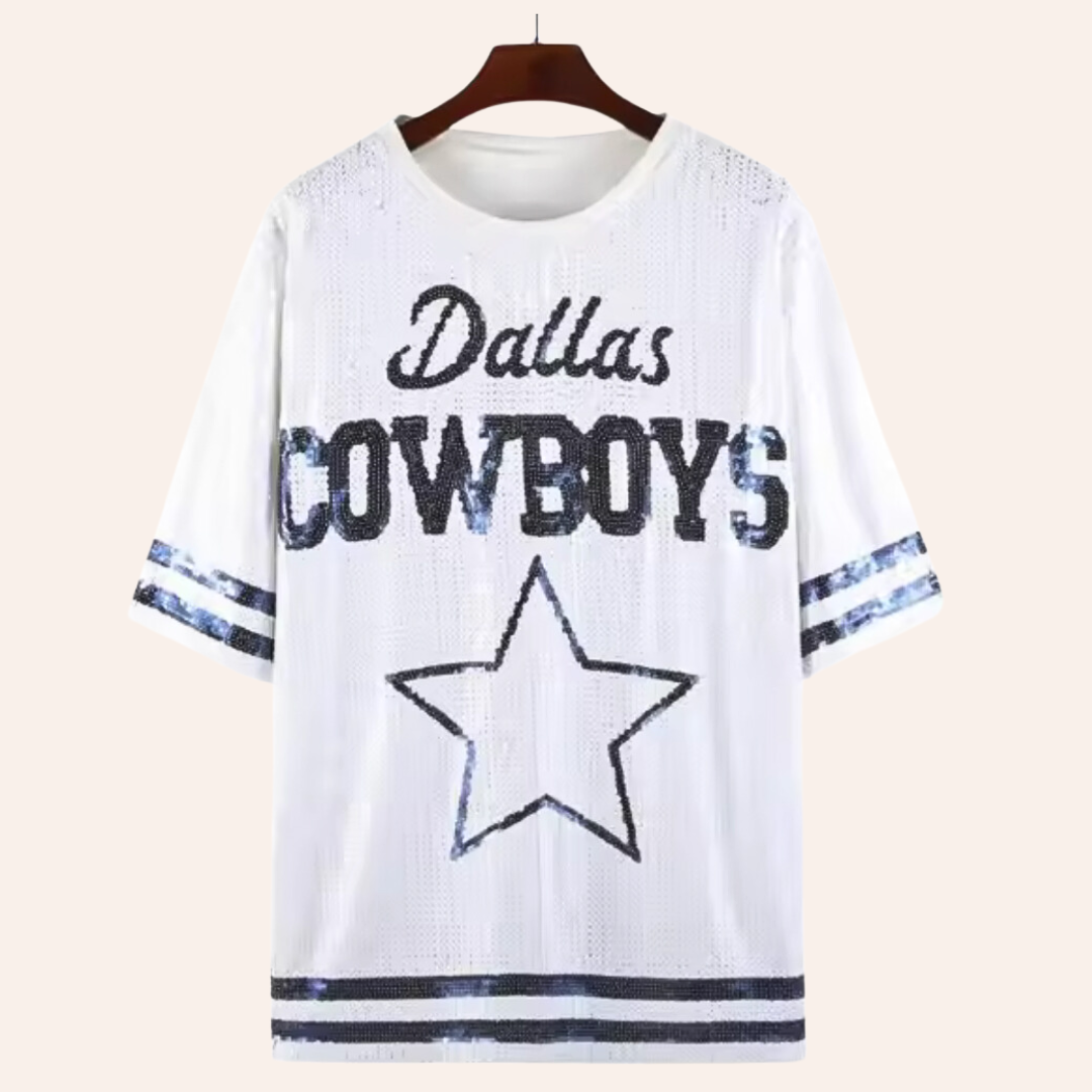 Show off your team in style with the Dallas Cowboys Sequins Short Sleeve T-Shirt Jersey. Featuring a sparkling sequined Dallas Cowboy logo, this tee combines team pride with a fun, stylish twist. Perfect for game days or casual wear, it’s comfortable, lightweight, and a great addition to any fan’s wardrobe.
