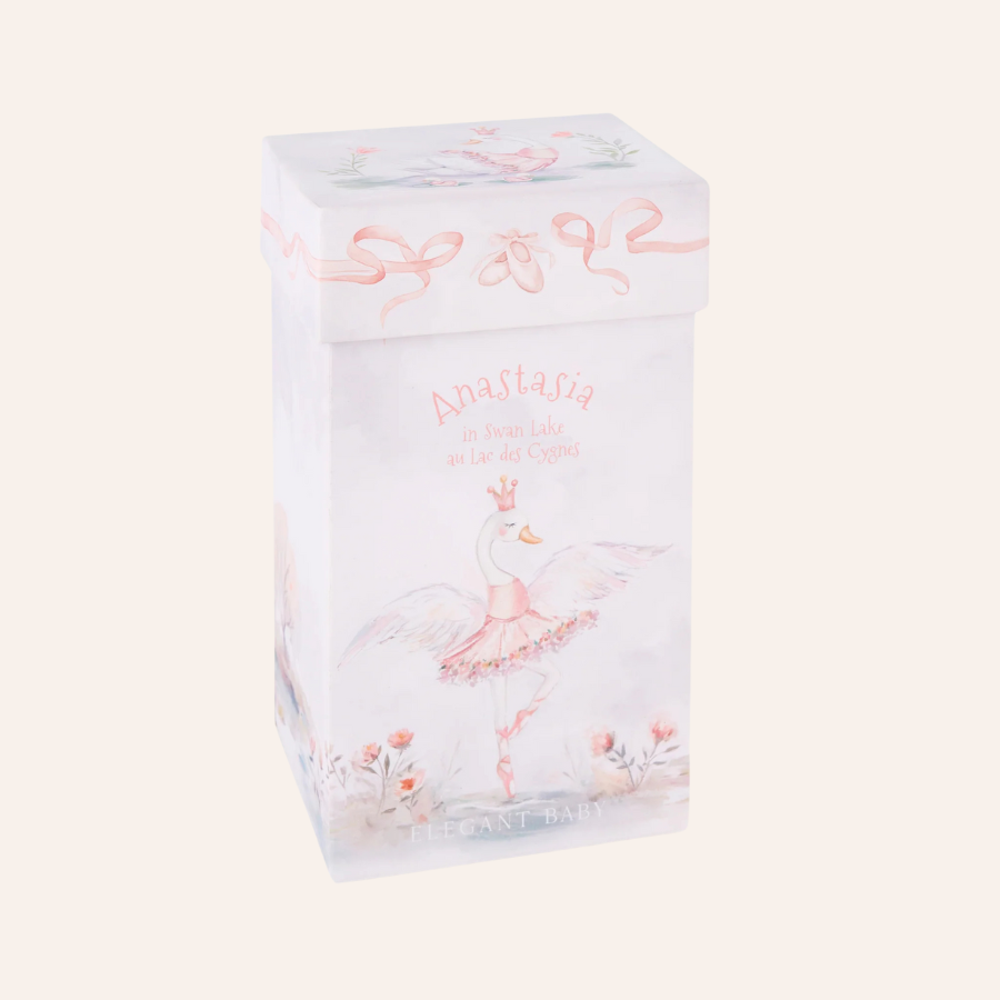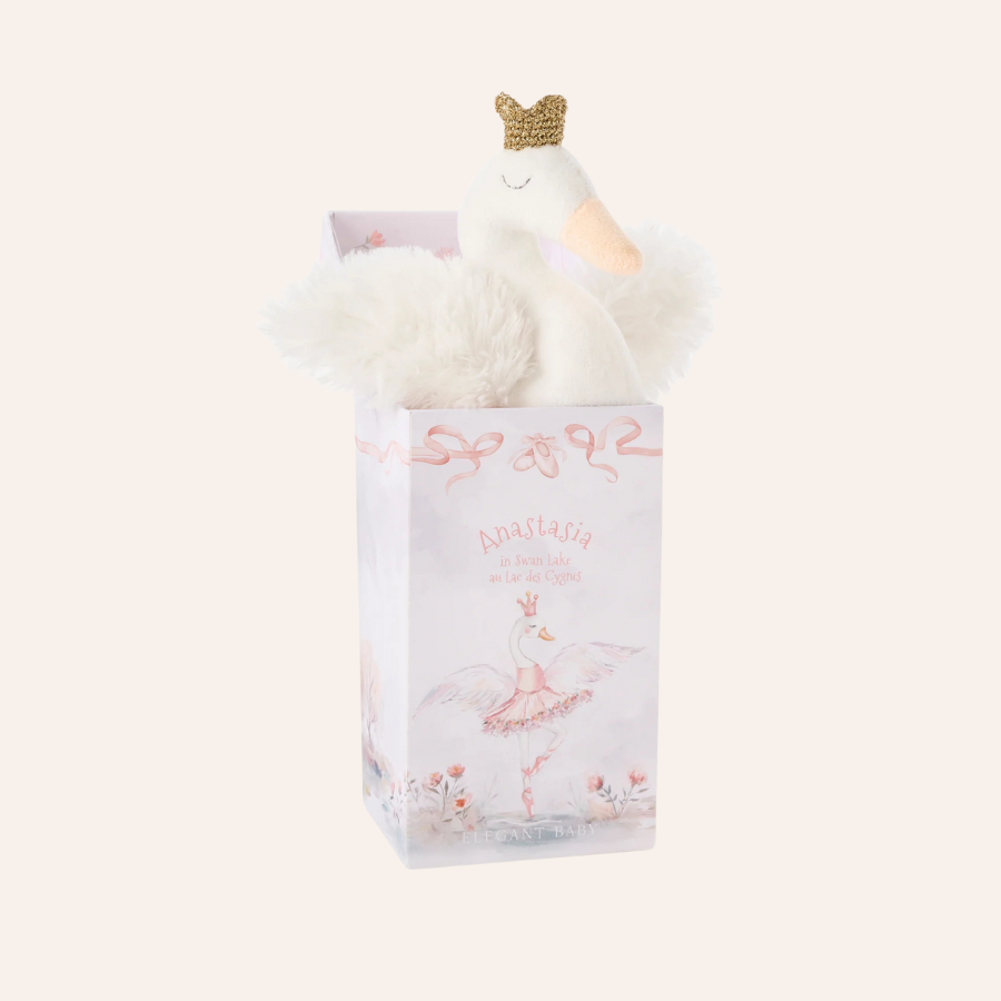 Anastasia the Ballerina Swan is a vision of grace, adorned with delicate details that inspire dreams of pirouettes and grand jetés. Nestled in a hand-illustrated gift box, she's a timeless keepsake for little dancers and plush collectors alike.