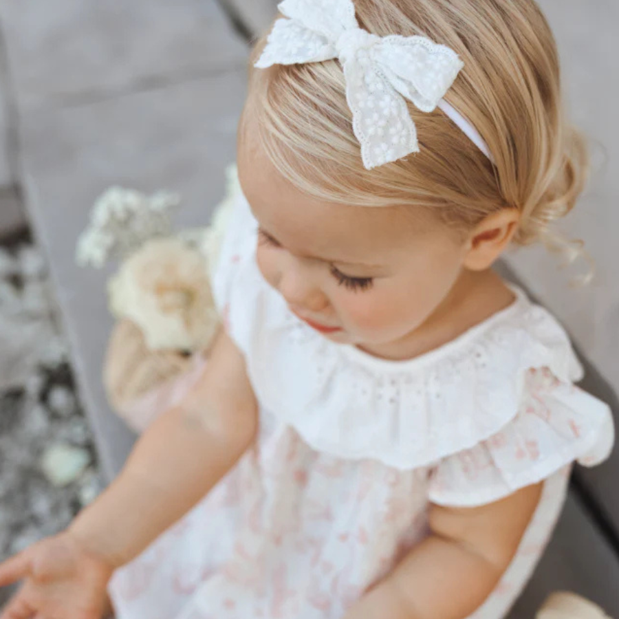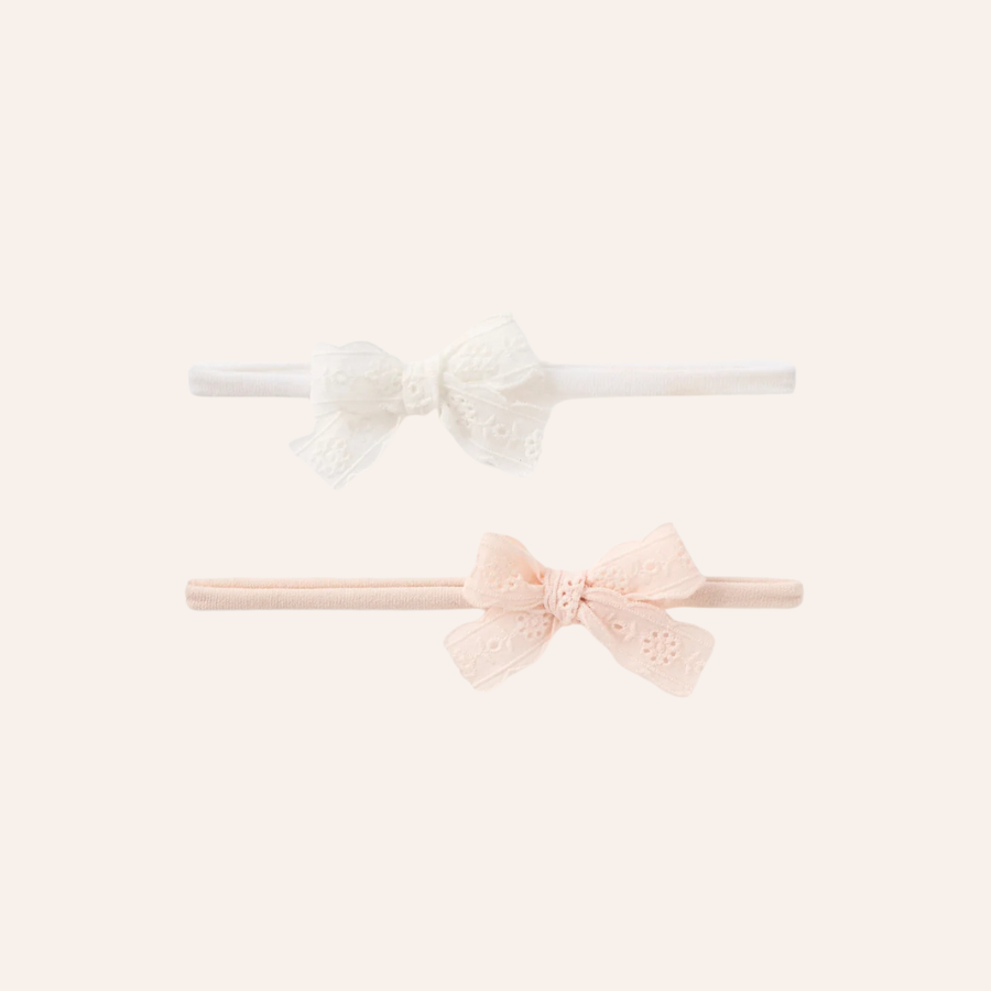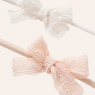 A timeless accessory for little ones, this 2-pack of eyelet lace bow headbands in soft pink and white adds a classic touch to any outfit. Designed with a gentle nylon band for a comfortable fit, they're as sweet as they are soft.