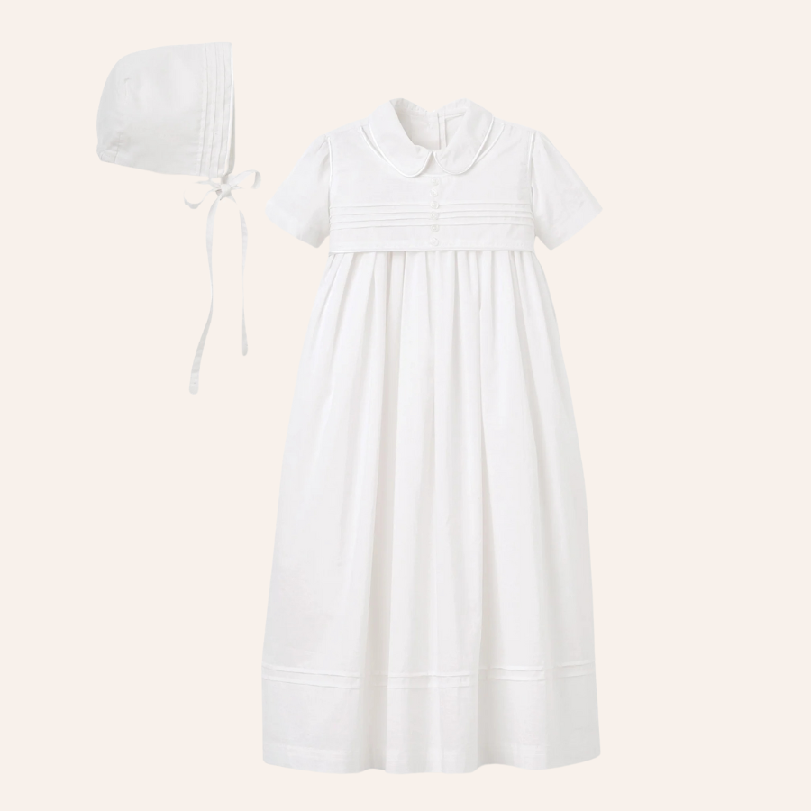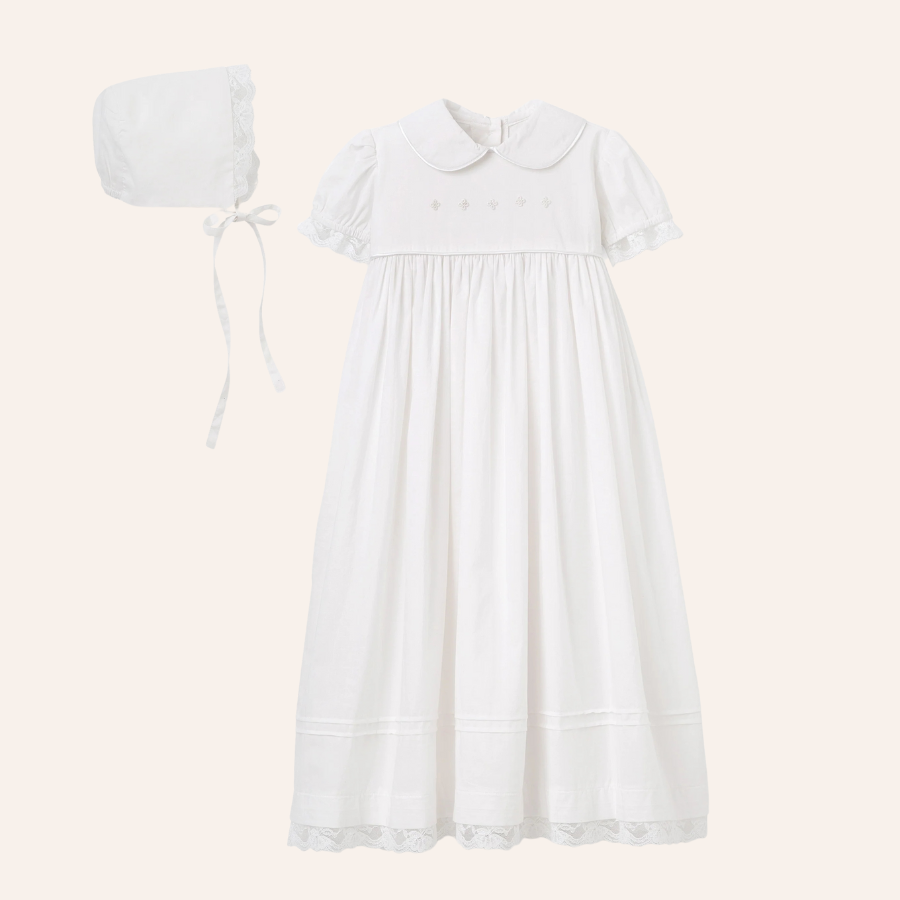 This heirloom quality Christening gown is a beautiful keepsake that can be handed down for generations. Made from soft 100% cotton voile with beautiful embroidery details and pin tucking. Perfect for Christening day, the gown comes with matching bonnet and is presented on a padded hanger with a protective organza bag.