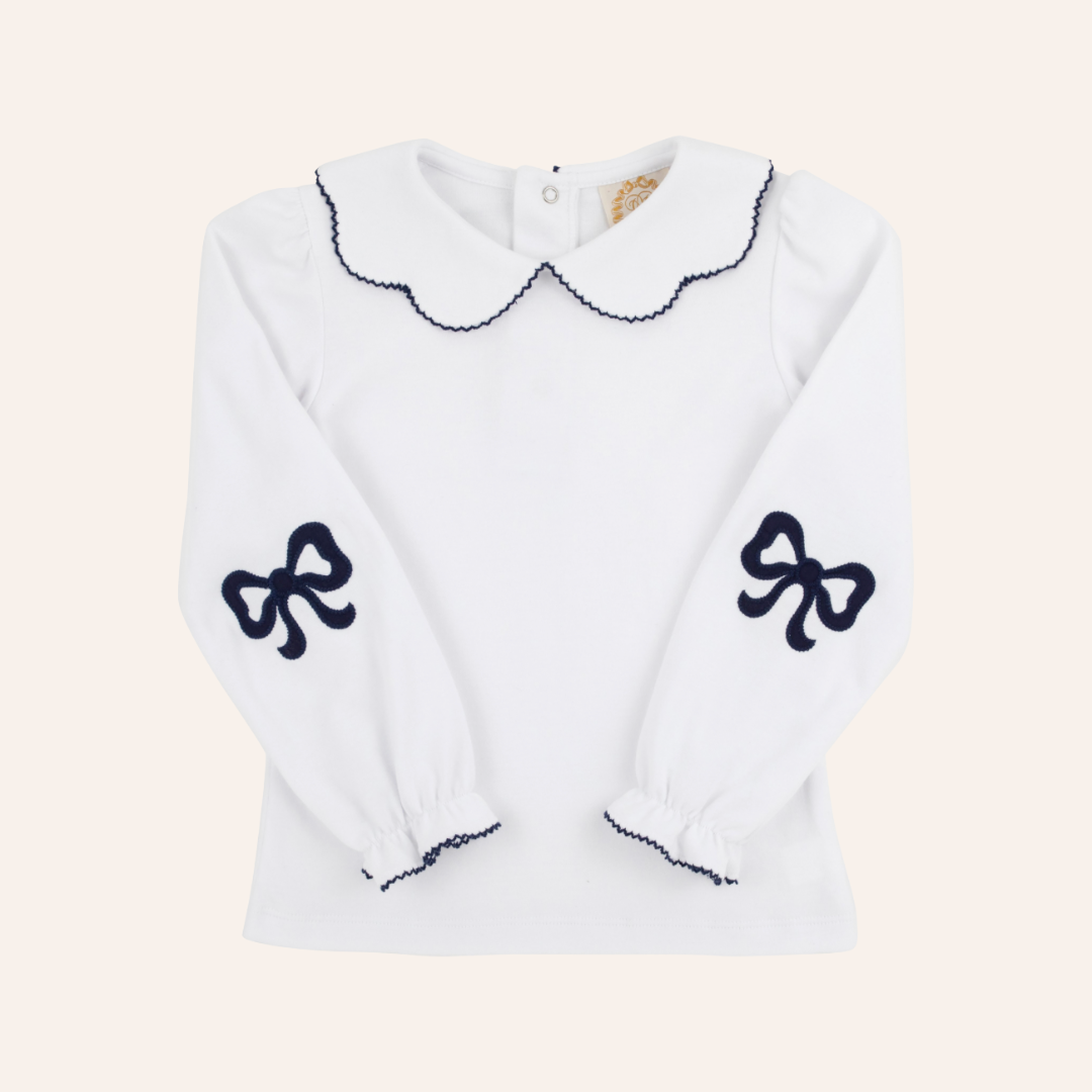 Our Emma's Elbow Patch Top in Worth Avenue White makes our heart skip a beat with the Nantucket Navy bow elbow patches! We think every little girl should own this sweet top.