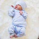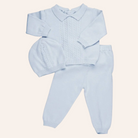 A must-have for every baby boy's wardrobe! This classy set is warm and cozy with its soft knit cotton, available in blue, white, and grey. Features classy cable knit down the center, as well as a sharp pointed collar and ribbed cuffs. Includes a coordinating hat with a matching cable design for keeping that little head warm and finishing off the look.