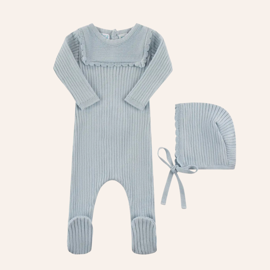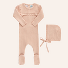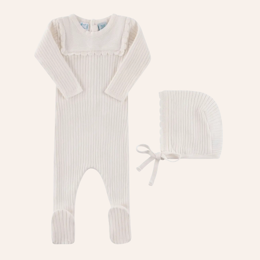 Meet a timeless knit baby romper, made of the softest, warmest cotton, with a matching bonnet included! Romper and bonnet are both made of classic ribbed knit with the sweetest scalloped trim. Matching knit baby blanket available as well, for a complete layette set!