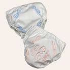Four hand embroidered bows surround a blank area for a monogram. Double lined with elastic waist and legs. Made on our 200-count soft cotton and available in 2 colors: blue and pink. one size only.