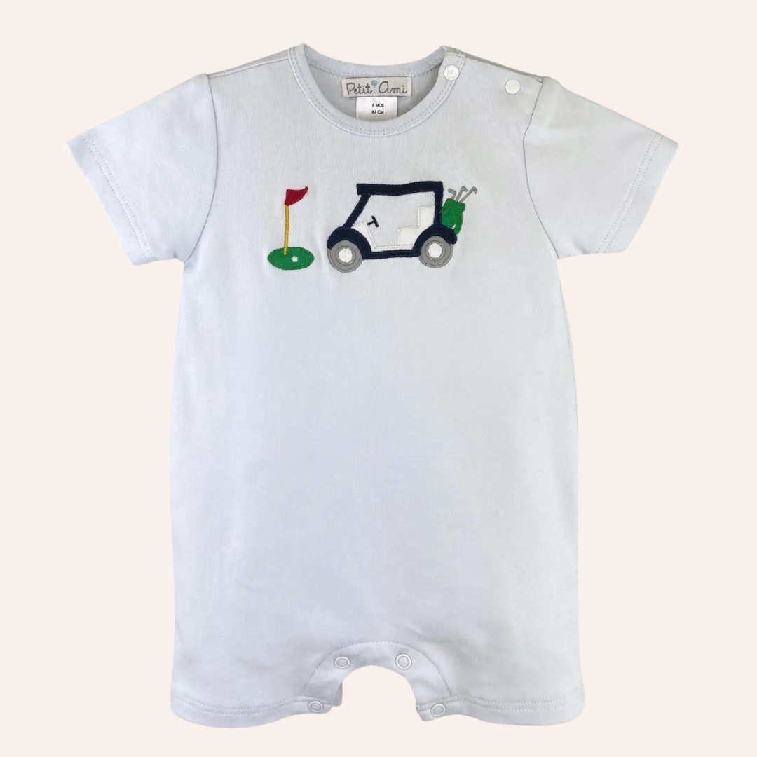 A sweet and simple outfit that is perfect for summertime fun at the golf course with dad or just playing in the back yard! This short sleeve romper comes in pastel blue and features a super cute golf cart applique on the front. Made with 100% cotton fabric that is light weight and machine washable for easy care.