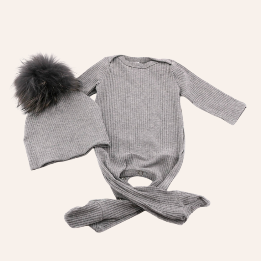Gray Ribbed Baby Footies with Pom Pom Hat Set
