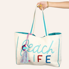 Life is good! Embroidered with the words "Beach Life", this durable cotton canvas tote with tassel charm is a cute beach bag for days filled with fun in the sun.