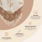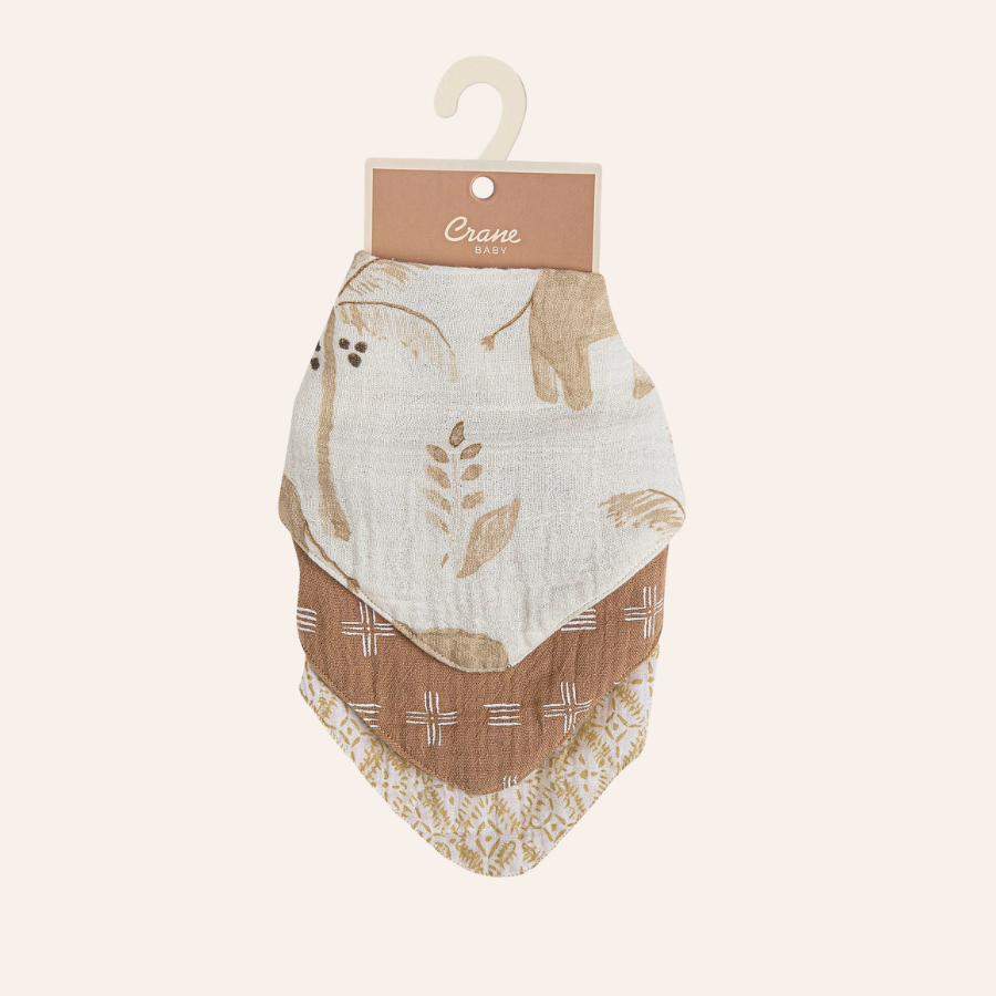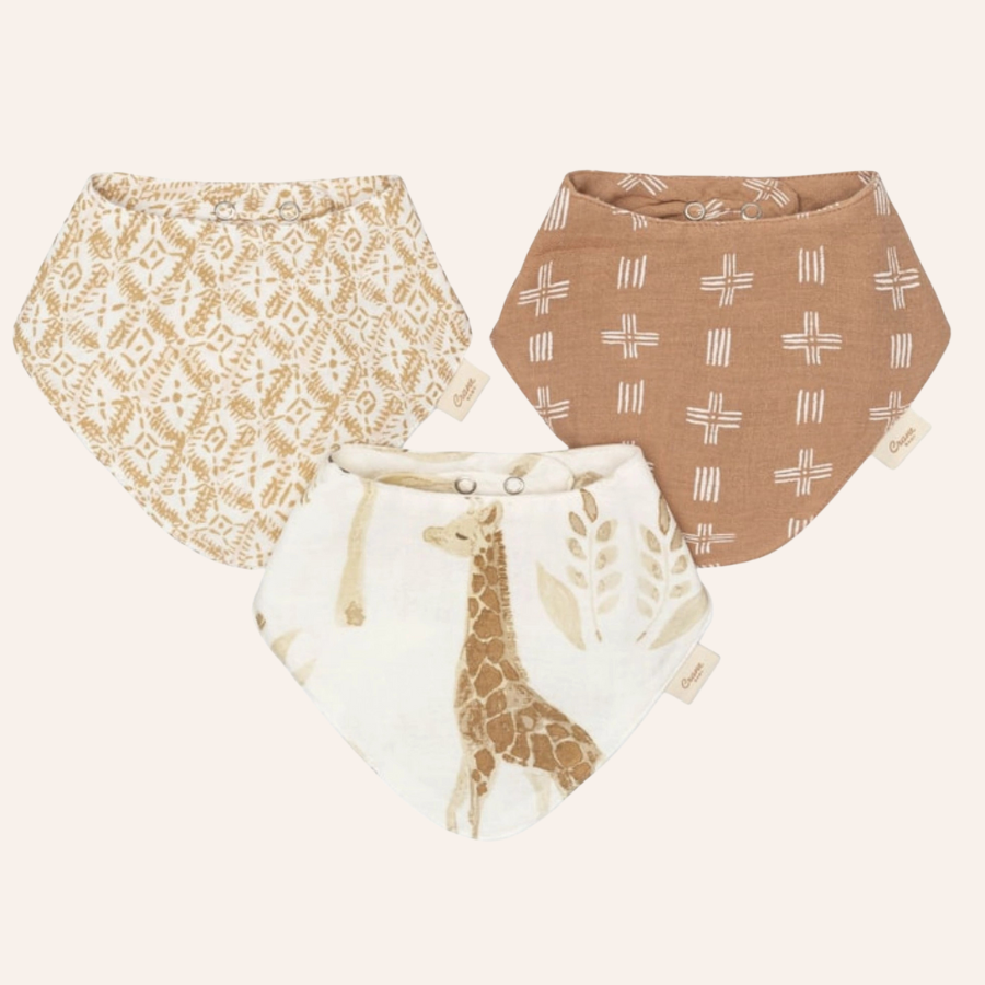 Lightweight and absorbent, our 100% cotton 4 layer muslin bibs are the perfect layering piece to accent baby's "outfit of the day." Featuring adjustable snaps to grow with baby, the set includes 3 unique bib designs. Bibs are an essential to keep baby clean and dry. The perfect gift idea to bundle with our swaddle wraps and burp cloths available in the same print designs.