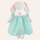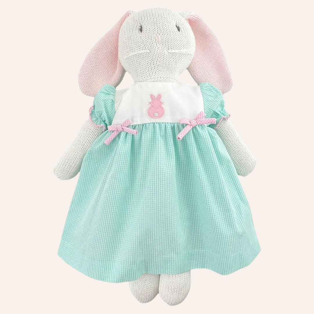 This hand-knit Easter bunny doll comes with an adorable short sleeve mint check dress with sweet embroidered bunny design on the front and pink bows.