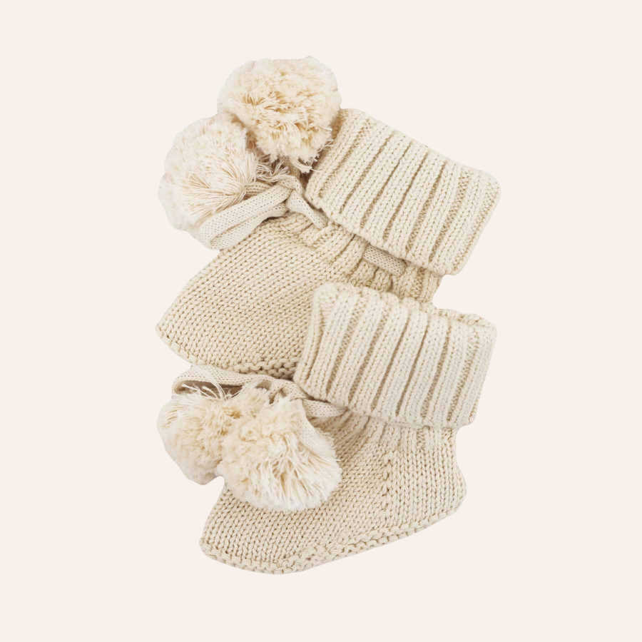 Complete your little one's matching set and dress them in style for their first moments on Earth with these knit pom pom booties! Made with love and extra cozy fabric, these booties ensure a snug fit that will stay put, keeping those tiny toes toasty and protected. Coming in four stylish, yet versatile colors, these knit booties will be the most precious keepsake that will be kept for years to come as your baby grows, and are a must-have for every baby's wardrobe!