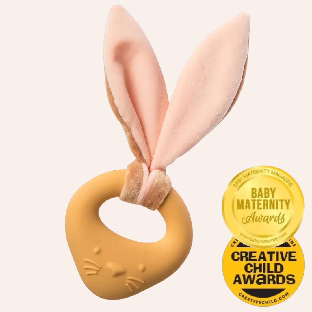 9” Leika Little Bunny baby teether features a fabric tail and ears. Teether has face details molded into silicone. Velour tail/ears are removable and machine washable. Made from baby-safe silicone (BPA, PVC, and Phthalate free). Silicone teether is dishwasher safe or surface washable. This product is made to strict quality standards to meet or exceed US safety requirements.