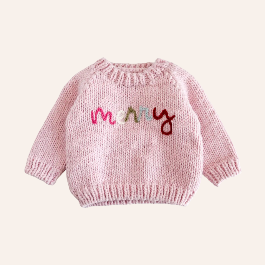 This sweater is hand-embroidered with "merry" in multicolored script celebrating the colorful and joyous sprit of the season. Match with our Merry Hat for the complete look.